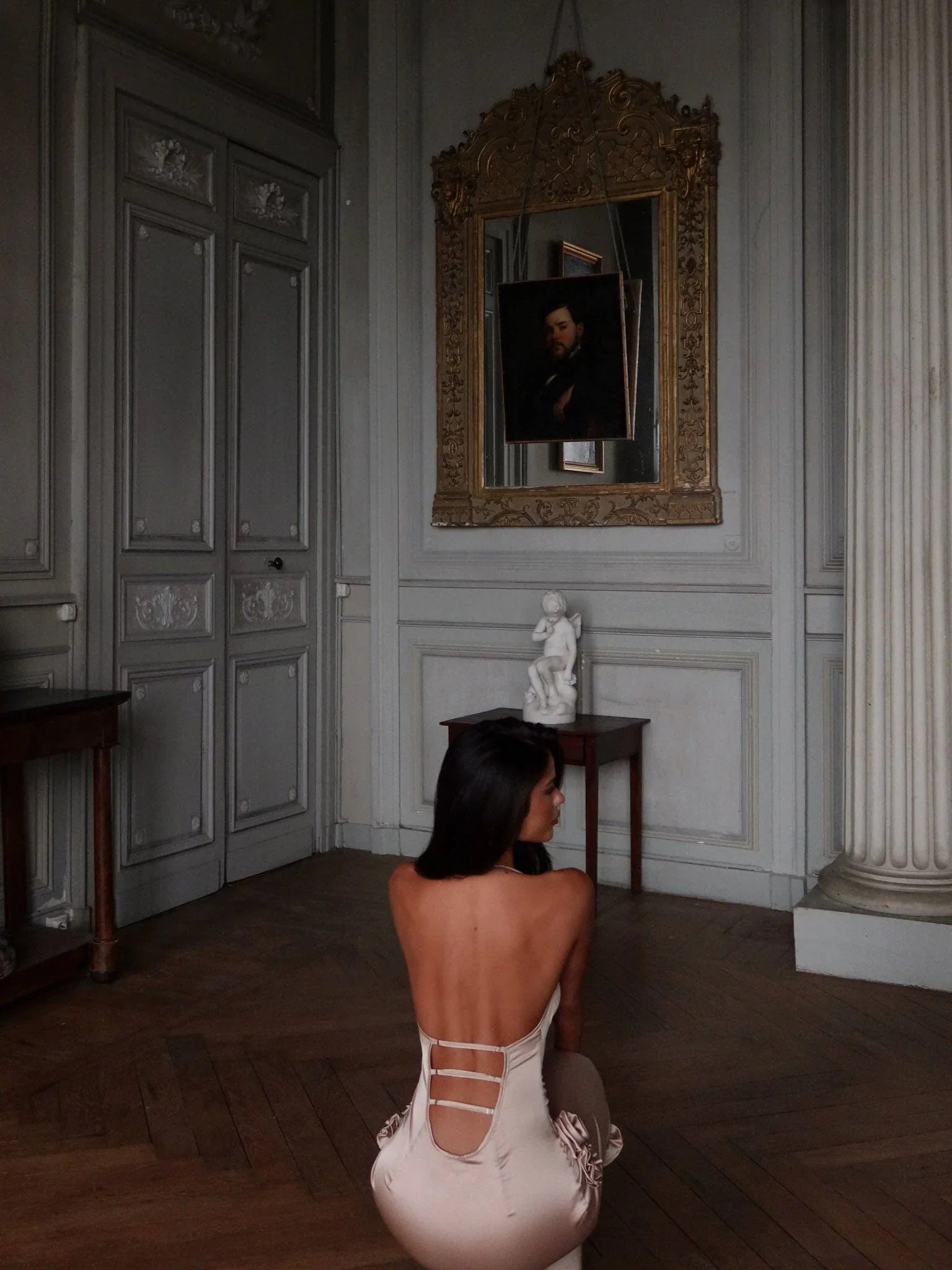Crafted from soft satin fabrication, this maxi dress hugs your figure with a bodycon silhouette, ensuring a flawless fit. Her cowl neckline is delicately paired with a true tie halter neck that cascades into a backless design, accentuating elegance from every angle. Floral appliqués along the neckline and body add a romantic touch, while the leg split at the back enhances ease of movement and allure.