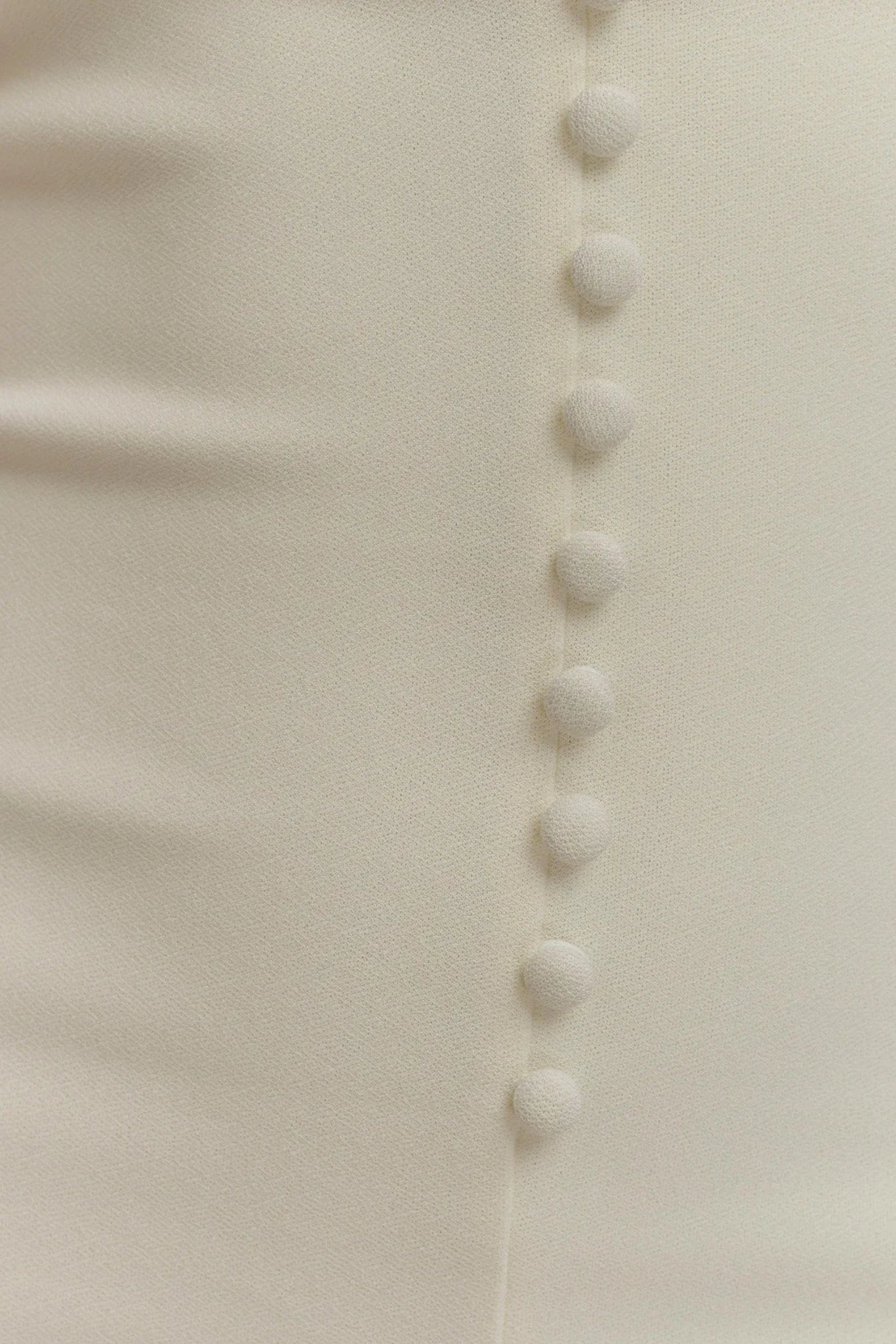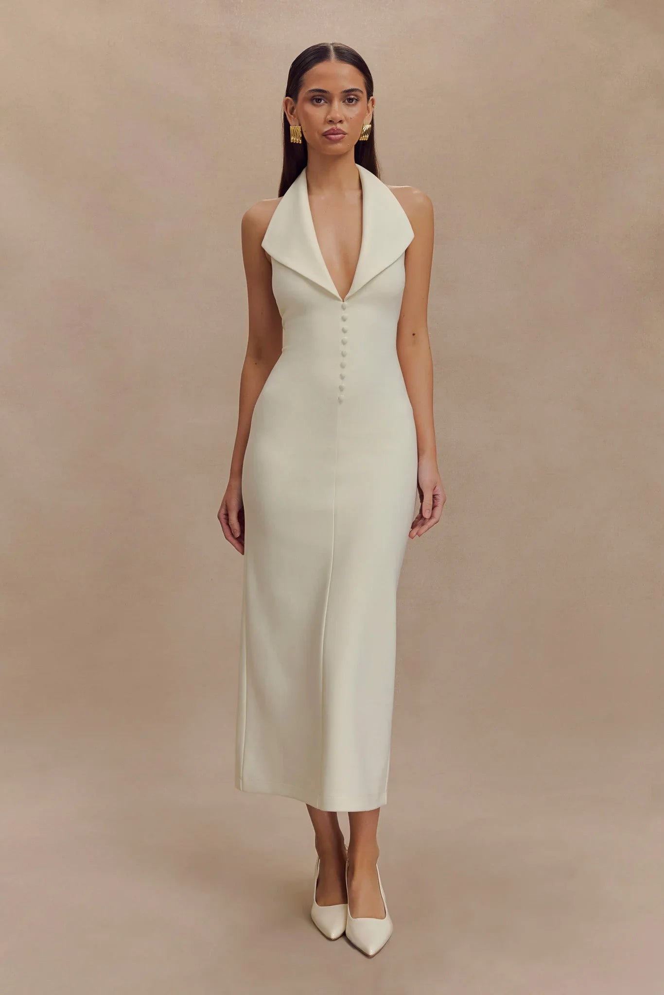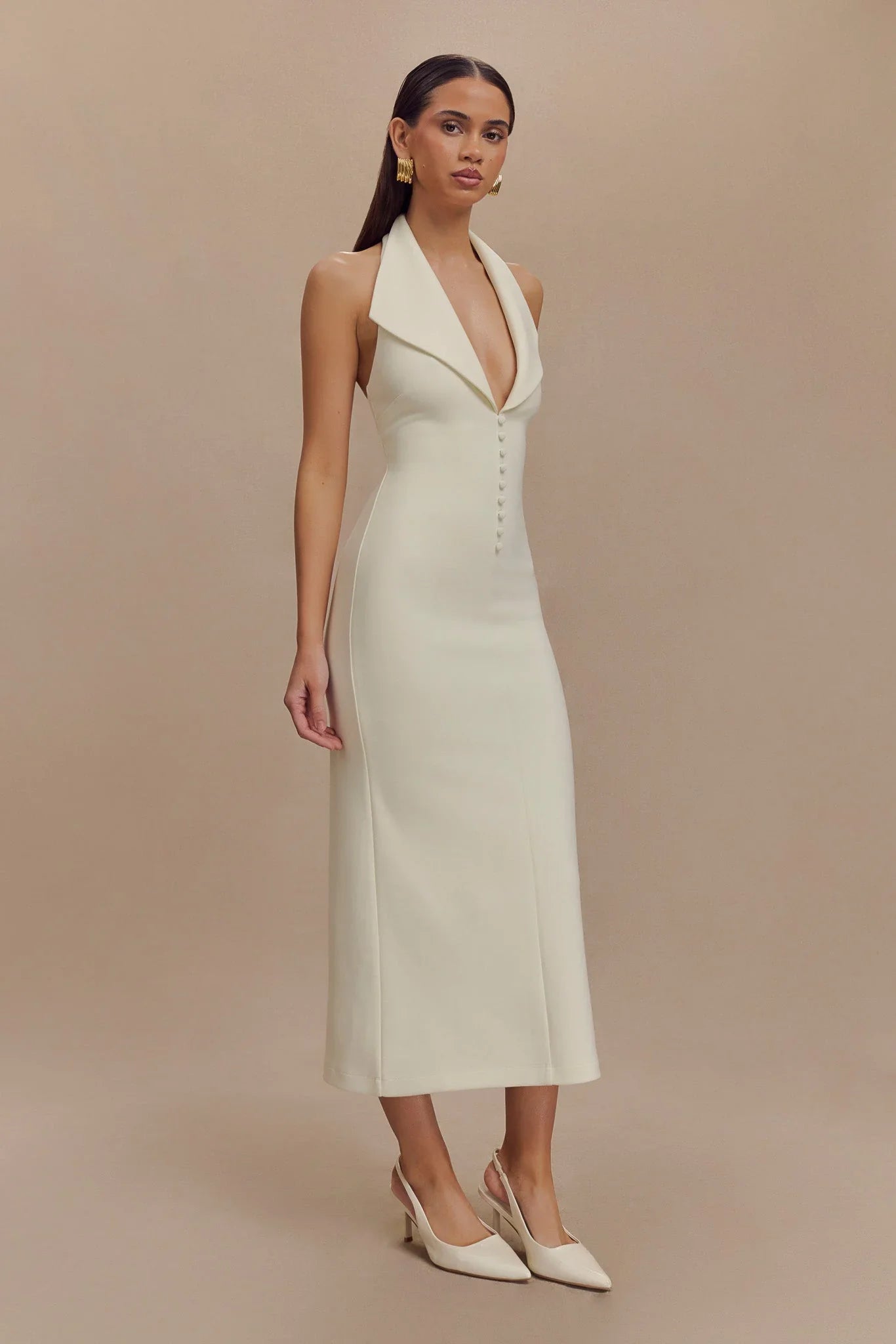 The ANNITA Crepe Halter Midi Dress exudes timeless elegance with its deep V neckline and halter design. Featuring a collared neckline and a button front (non-functional), this dress combines classic elements with a modern edge. The open back adds a touch of allure, while the fitted silhouette accentuates the figure gracefully. Crafted from luxurious crepe, the midi length offers a sophisticated and versatile option for any occasion, ensuring you make a stylish statement wherever you go.