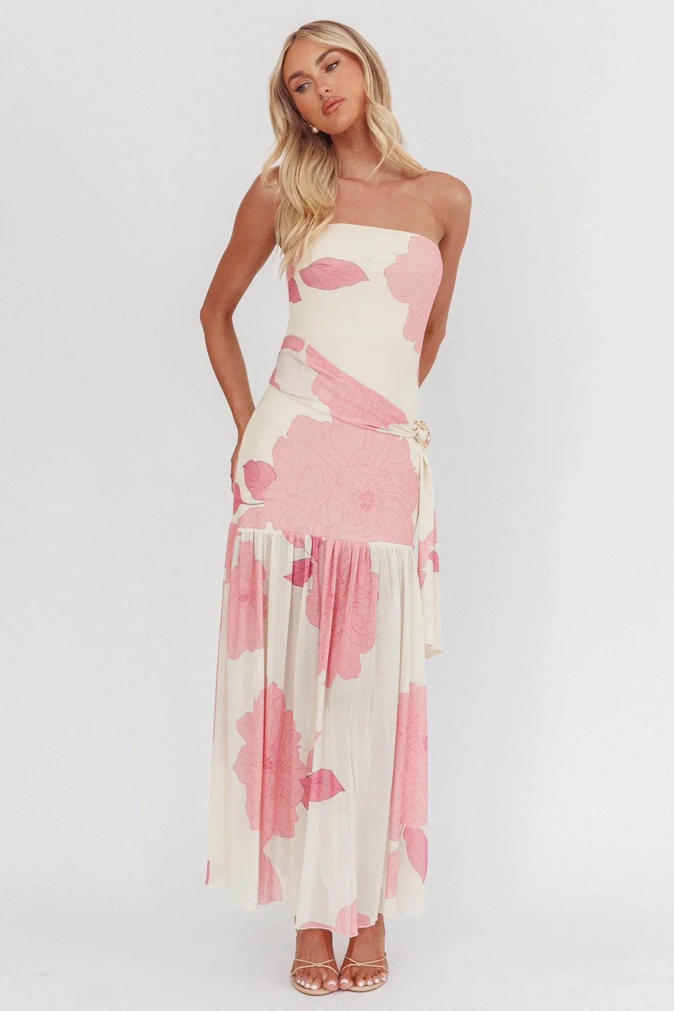 Make a statement in our gorgeous Antonella maxi dress. It features a strapless design and separate waist sash with a cute, gold buckle. It's just what you need for Friday night cocktails with your besties. Team it with strappy heels and a tote for a look that will turn heads.