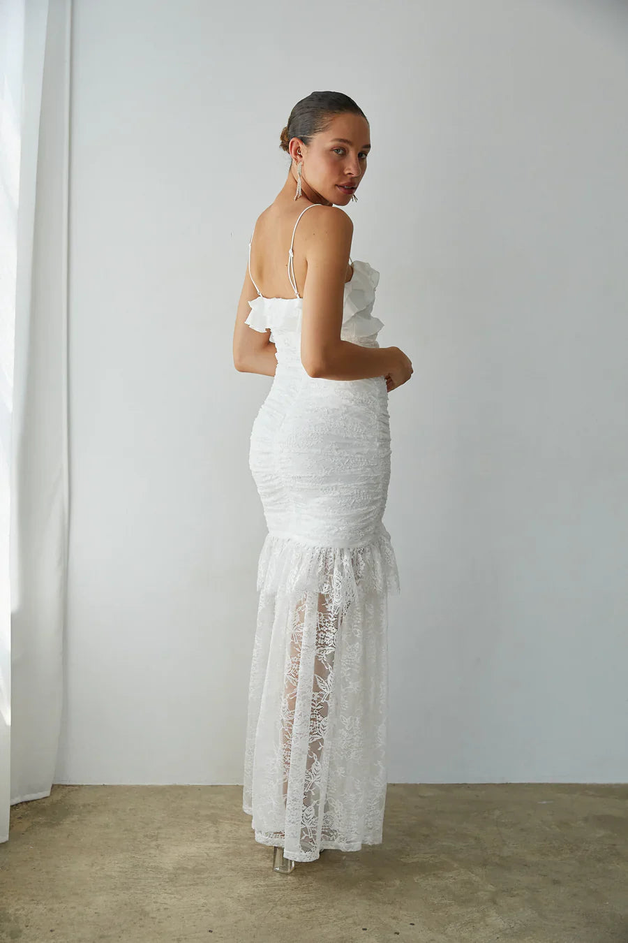 Hopelessly romantic, the Aphrodite Lace Ruched Rosette Maxi Dress is ! Fall in love with this lace featuring a lace rosette, high-low silhouette, and ruffle embellishments! Available in white; pair this angelic number with a pair of to complete the look!