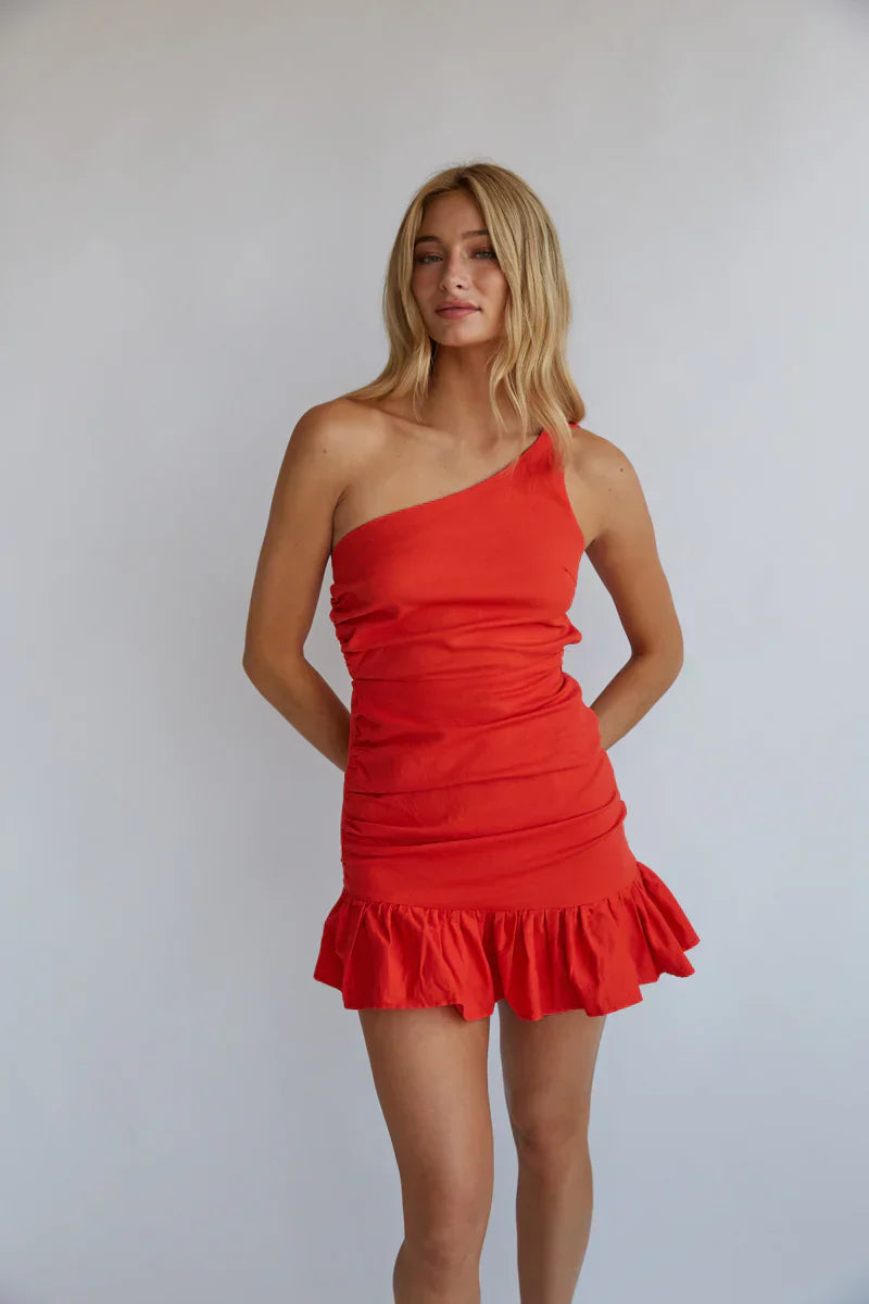 Be the life of the party in the Athena Ruched One Shoulder Mini Dress! Featuring a ruffle hem, open back, a ruched body, and an asymmetrical one shoulder strap. Step into some new to complete this party look.