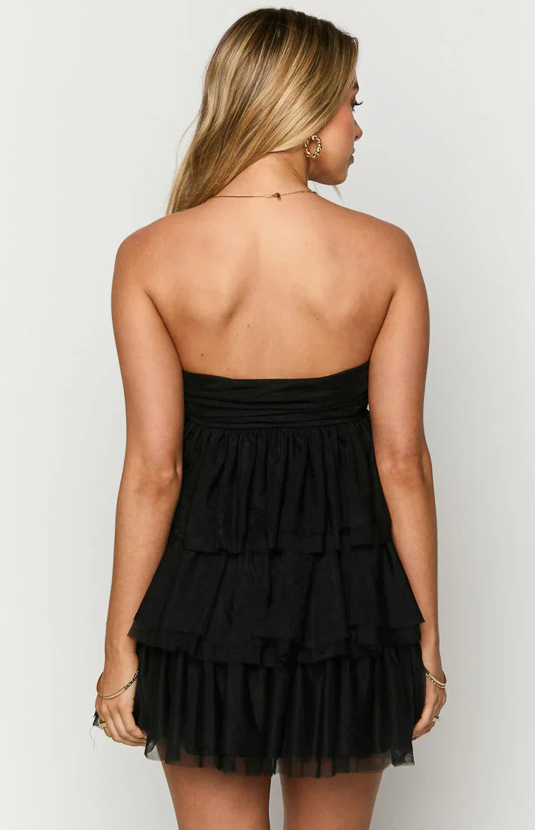 The tiered ruffles add a playful and flirty touch, making this a standout piece. The perfect birthday dress that gives a sophisticated yet fun vibe. Style it with strappy and statement for an elegant look to make a lasting impression. This dress is your go-to for any event where you want to feel confident and glamorous!