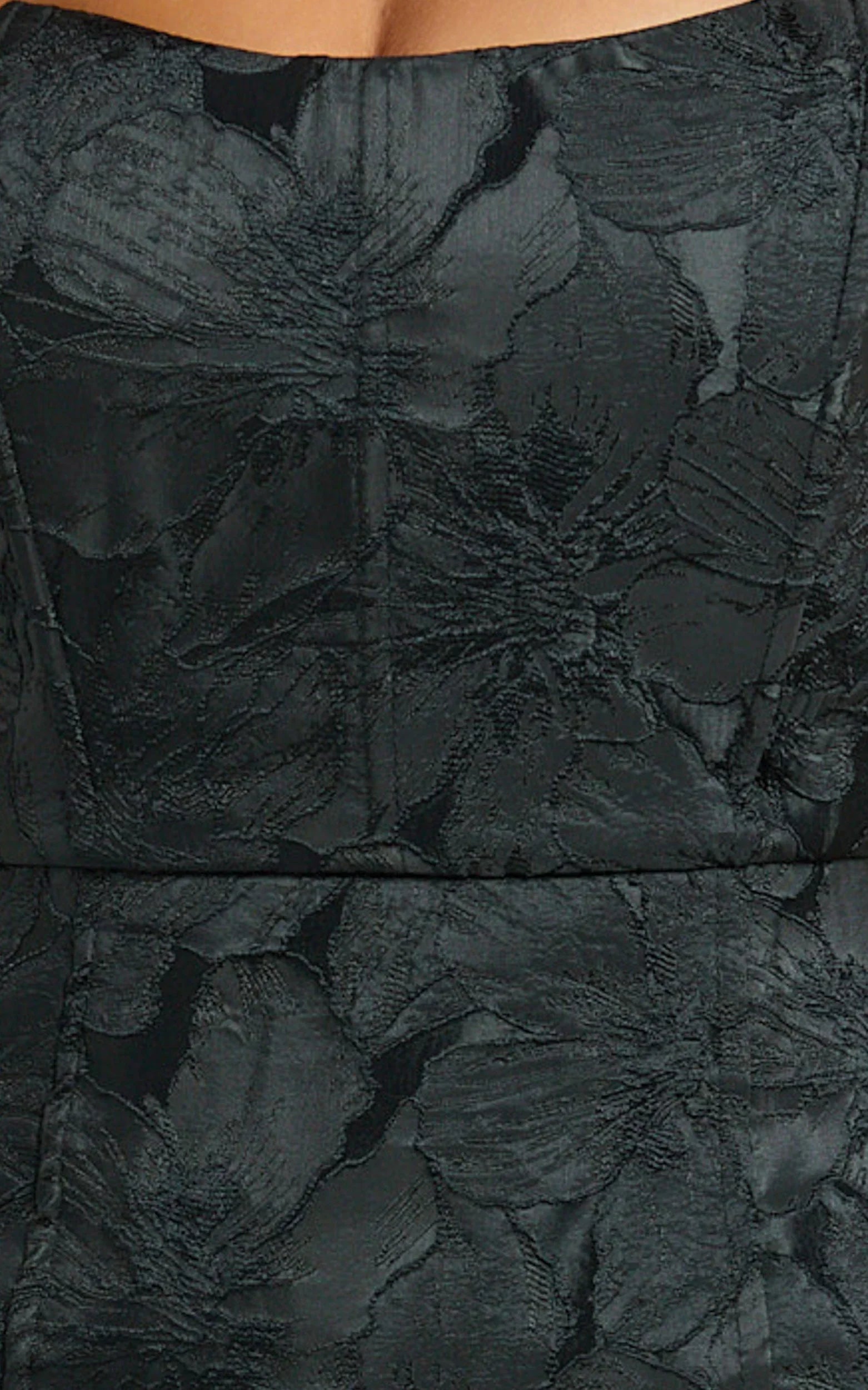 Crafted from sleek black jacquard, this strapless mini embodies a clean, monochrome aesthetic while capturing effortless, minimalist elegance. Featuring a structured bodice and flattering silhouette, it pairs perfectly with statement heels or knee-high boots and bold hoop earrings for that glam, street-style vibe.