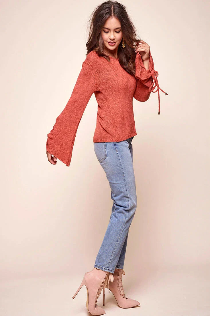Keep warm in this loose fit knit sweater with lace up details along the side. Keep things cas' with boyfriend jeans.
