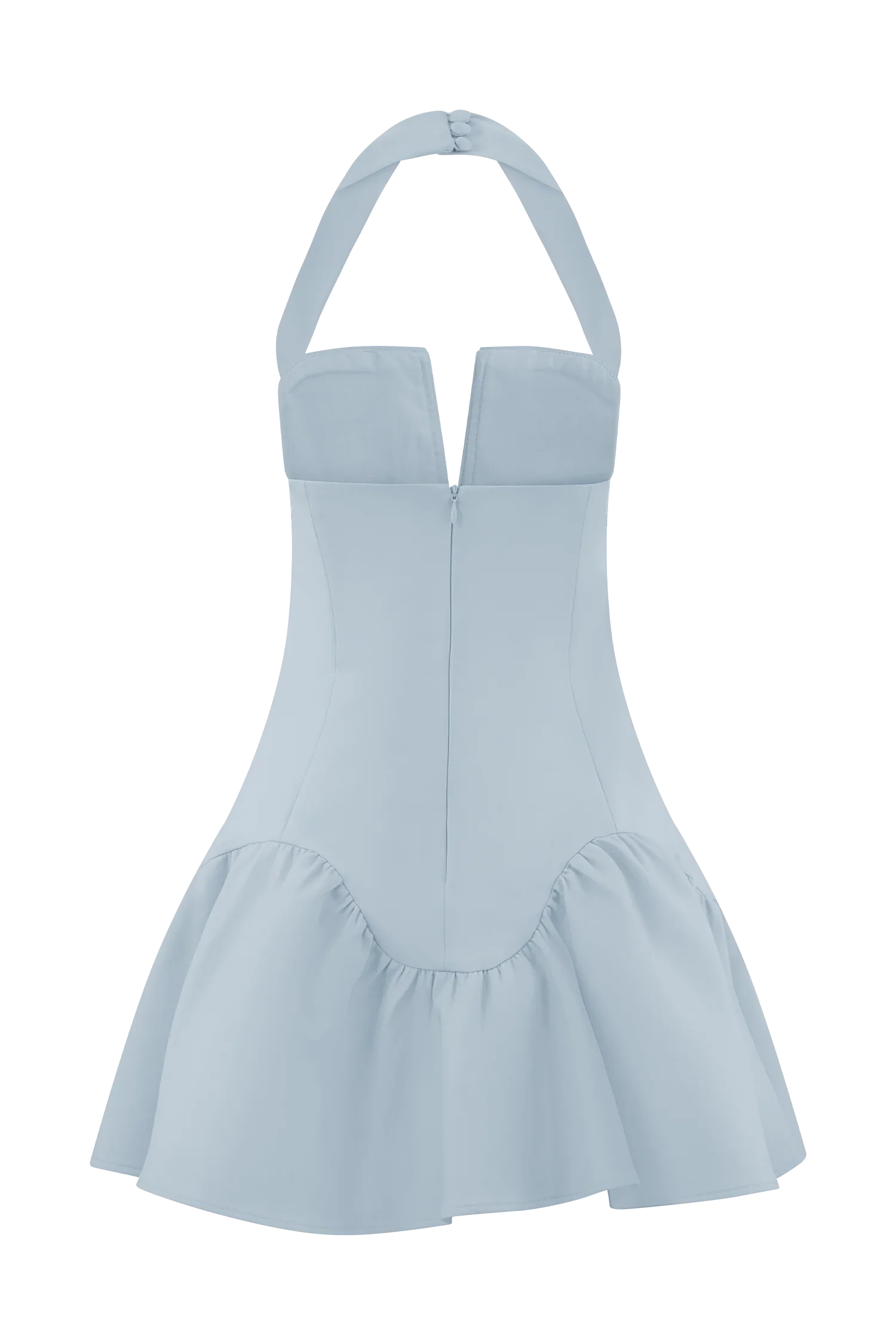 The CALIPSO Halter Mini Dress is a modern take on timeless elegance. Designed with a sophisticated halter neckline and a folded V-split detail, this dress exudes understated charm. The drop waist with a curved seam creates a flattering, elongated silhouette, while soft gathers in the skirt add graceful movement. Princess seam lines enhance the fit, and the invisible back zipper ensures a seamless finish. Partially lined for a lightweight feel, this dress is perfect for elevated daywear, cocktail events, or romantic evenings.