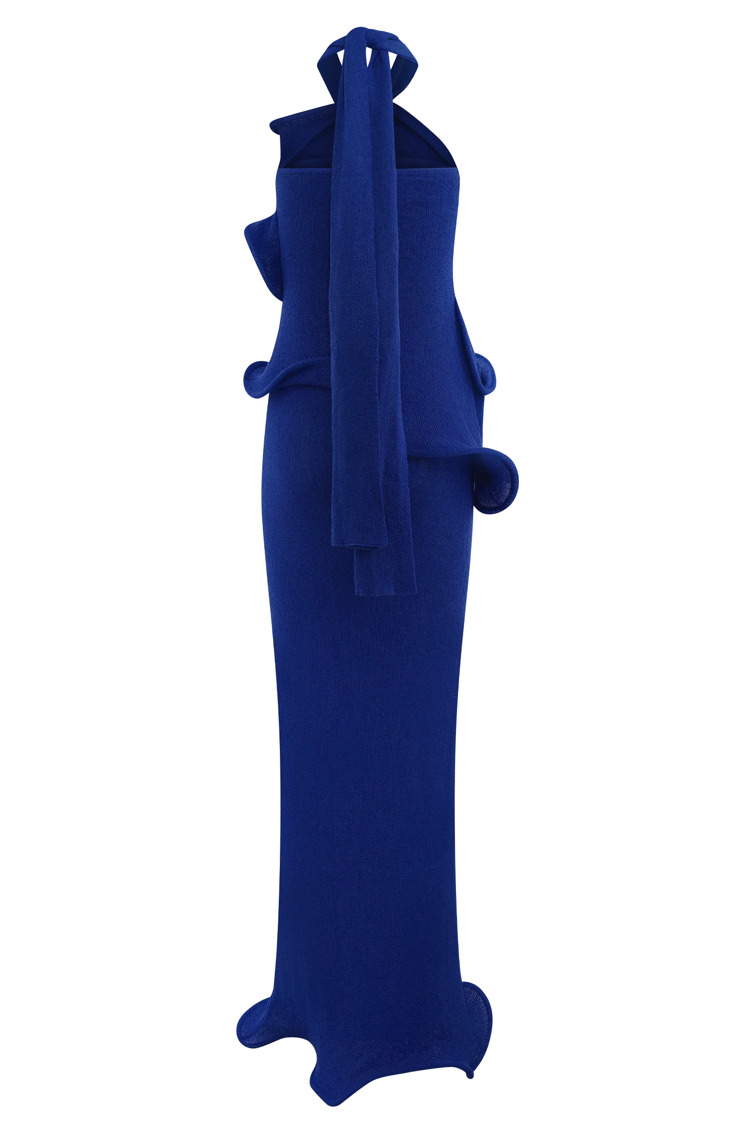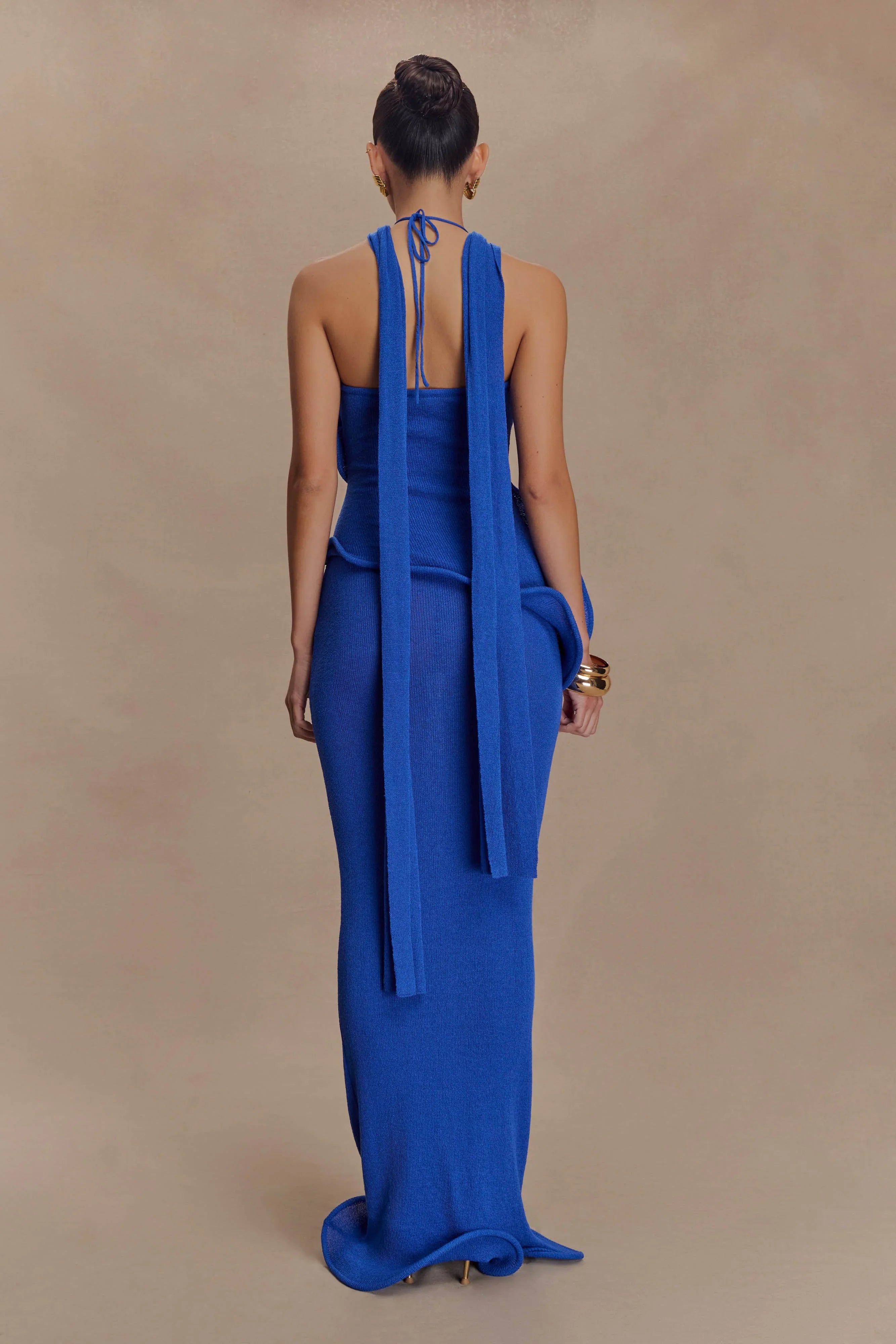 Turn heads in the CAPRICE Halter Knit Maxi Dress, a striking silhouette that flows with every step. Featuring a unique twisted halter neckline with an attached scarf detail, this dress brings a sense of drama and elegance to any occasion. The front and back wripple paneling sculpt the body, complemented by a fishtail shape and softly rippled hem for a fluid finish. Unlined for a lightweight feel, this dress is your go-to for elevated evenings and beyond.