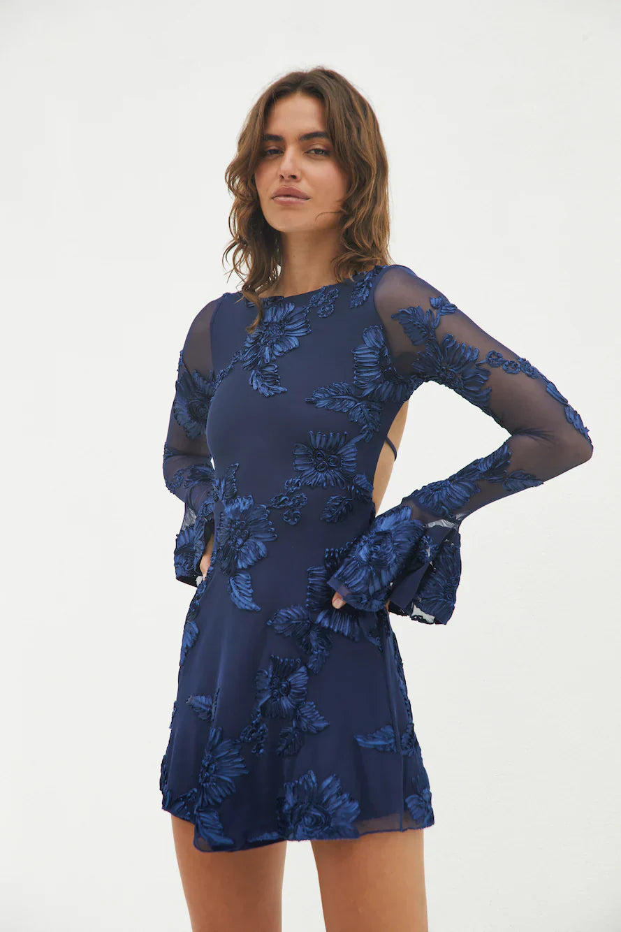 Turn heads in the Celeste Mini Dress in Navy, a statement piece made for enchanting evenings and unforgettable moments. Designed in a rich navy hue, this dress features intricate floral embroidery over sheer long sleeves, creating a striking contrast against the fitted silhouette.