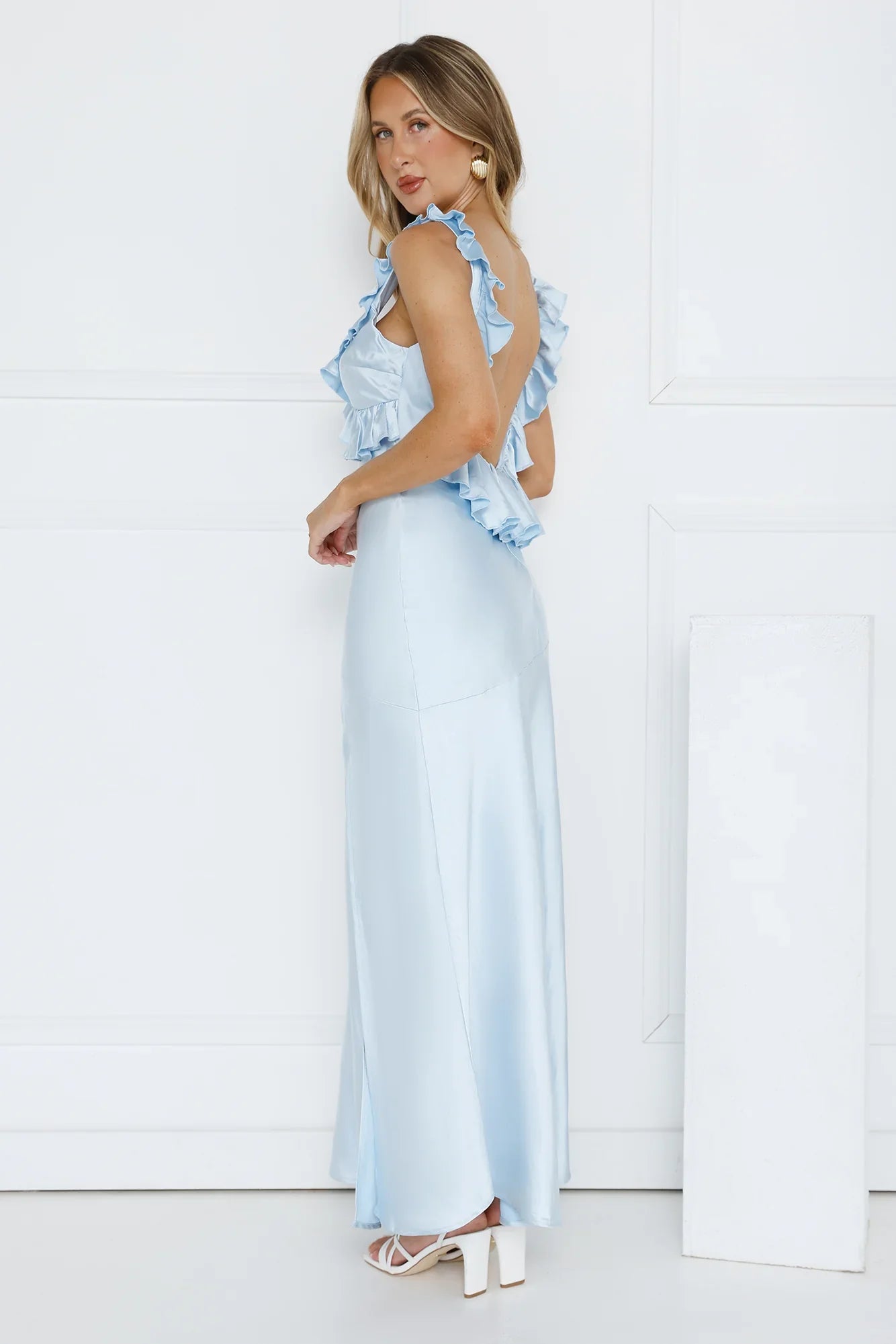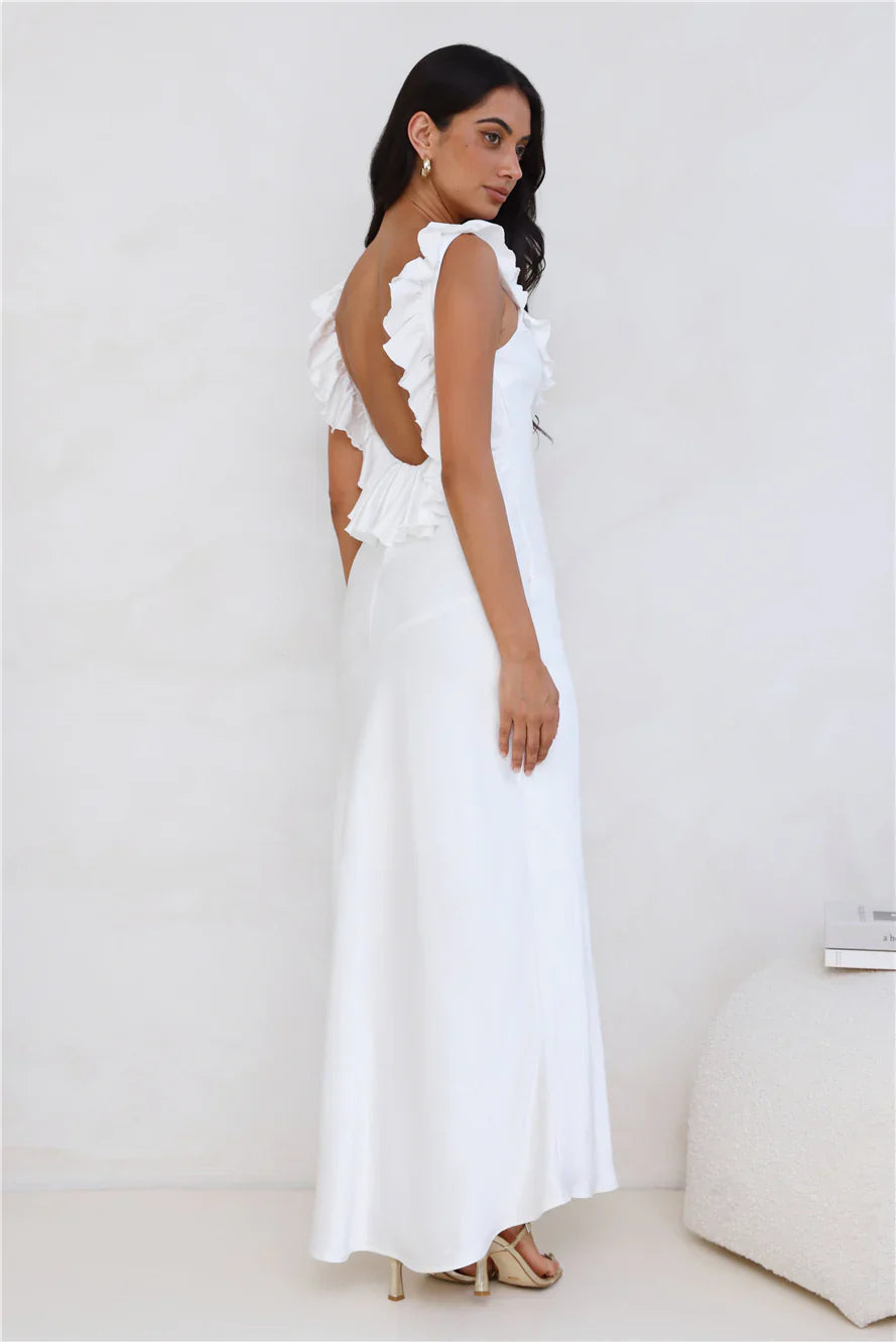 Enter the room in the most extravagant 'fit. The Chasing The Spark Satin Maxi Dress features a V-neck and an open back with frill details and a split to the skirt. Style with heels to turn heads.