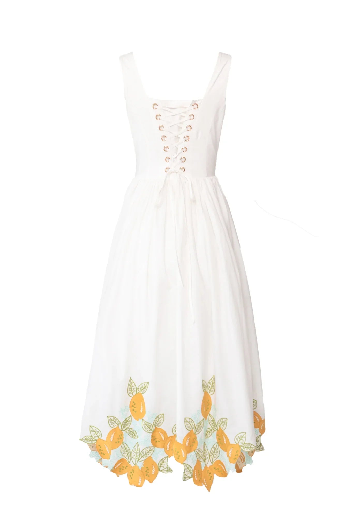 A sweet taste of summer. The Clarissa Dress is crafted from soft white cotton and embroidered with delicate lemons in yellow and green. With a sweetheart neckline, lace-up corset back, and hidden pockets, she’s charming, practical, and full of sunshine. Finished with matching accessories for that extra touch of joy.