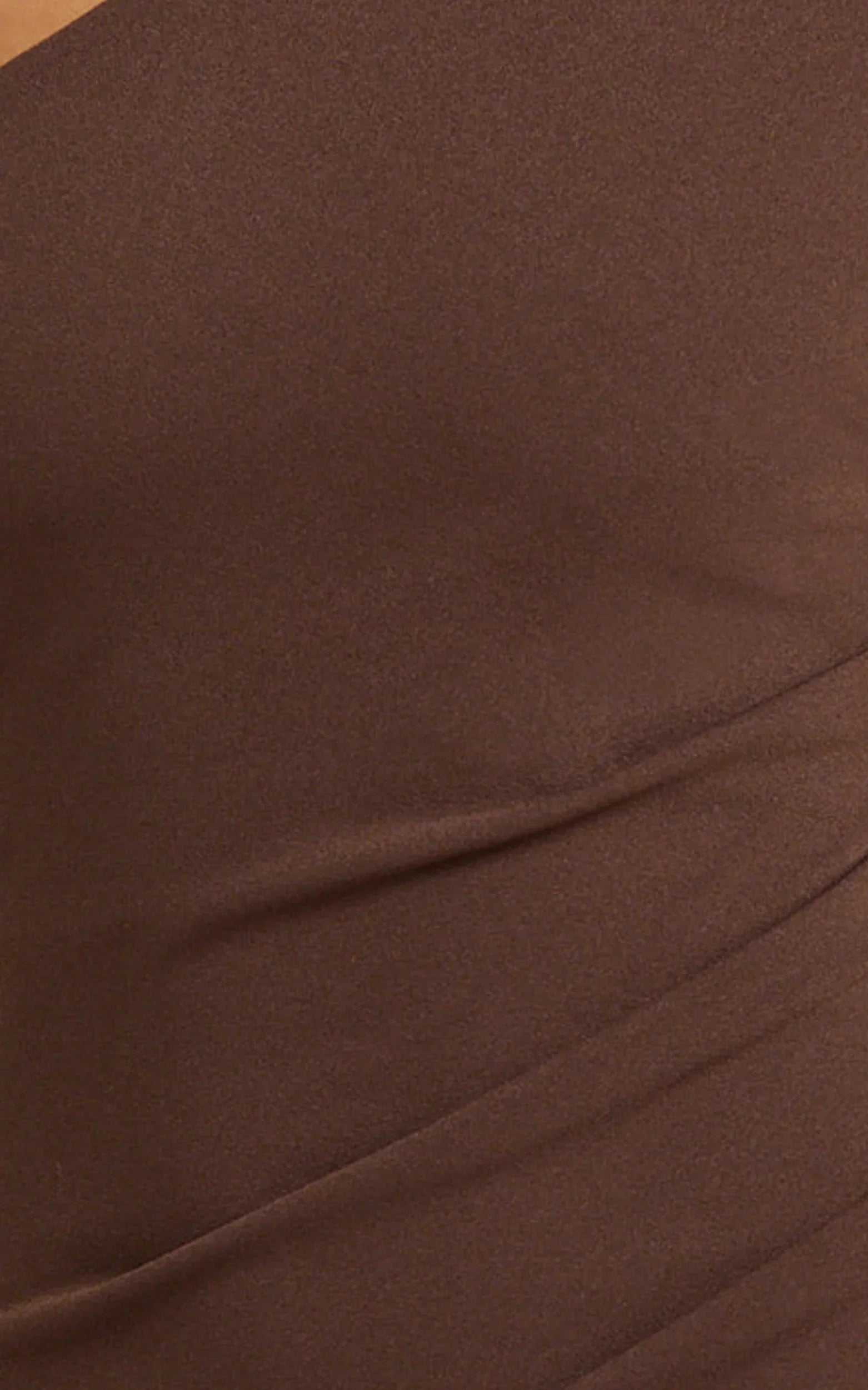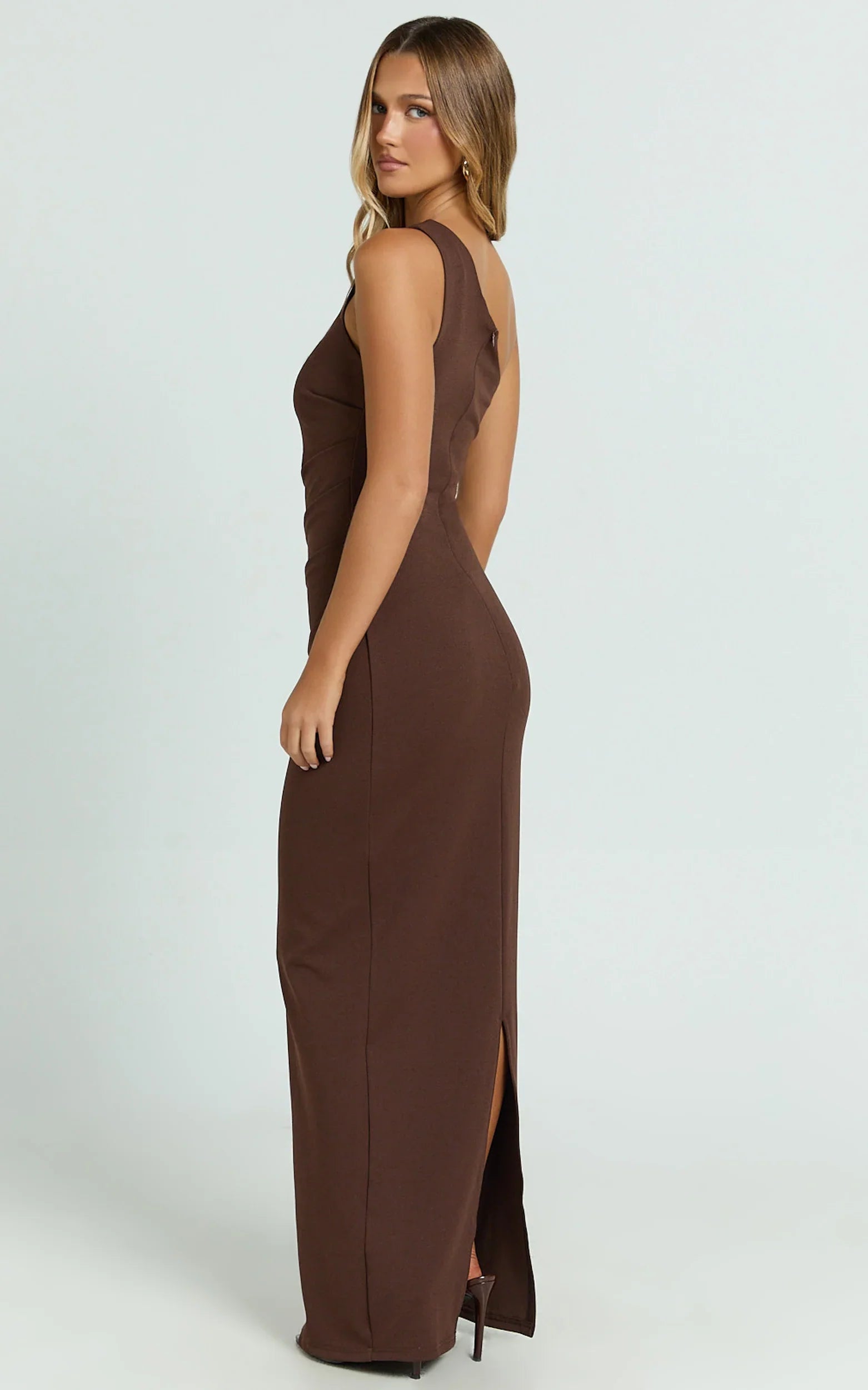 This stunning one-shoulder maxi in a rich chocolate brown shade is your perfect partner for making a bold style statement wherever you go. Blending minimalist elegance with vintage-inspired flair, it features an effortlessly chic silhouette and flowing lines that flatter every body type.