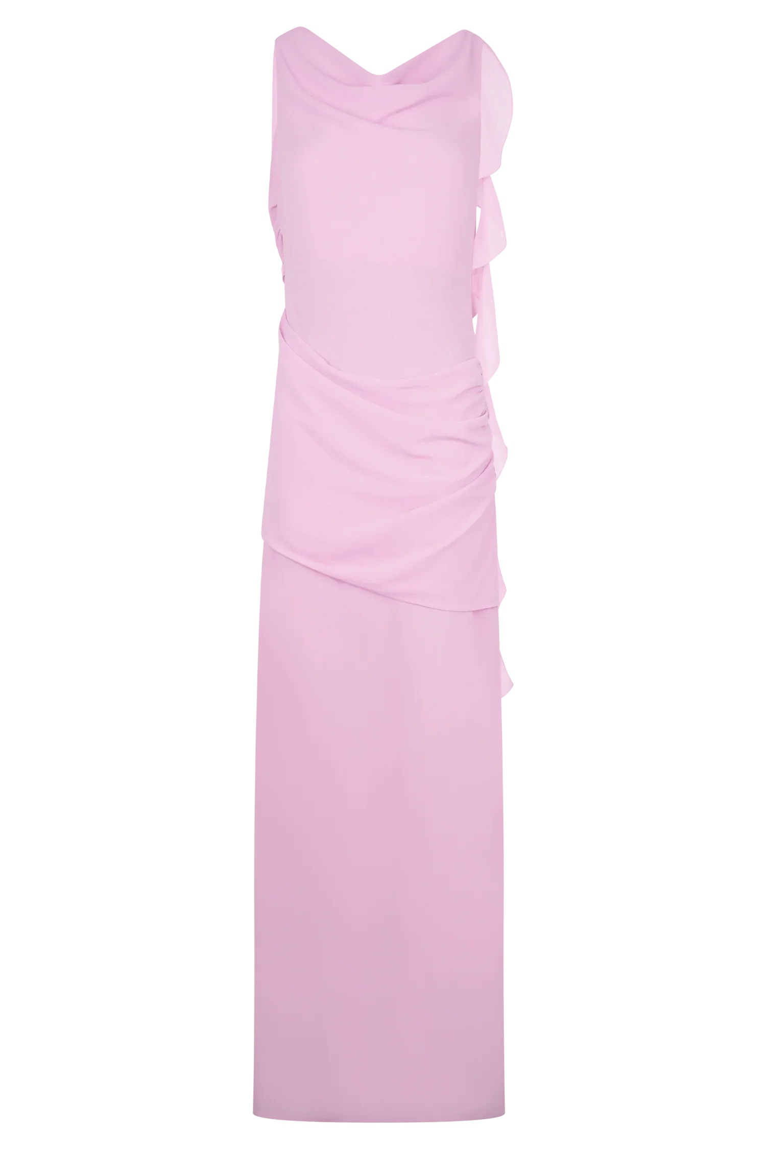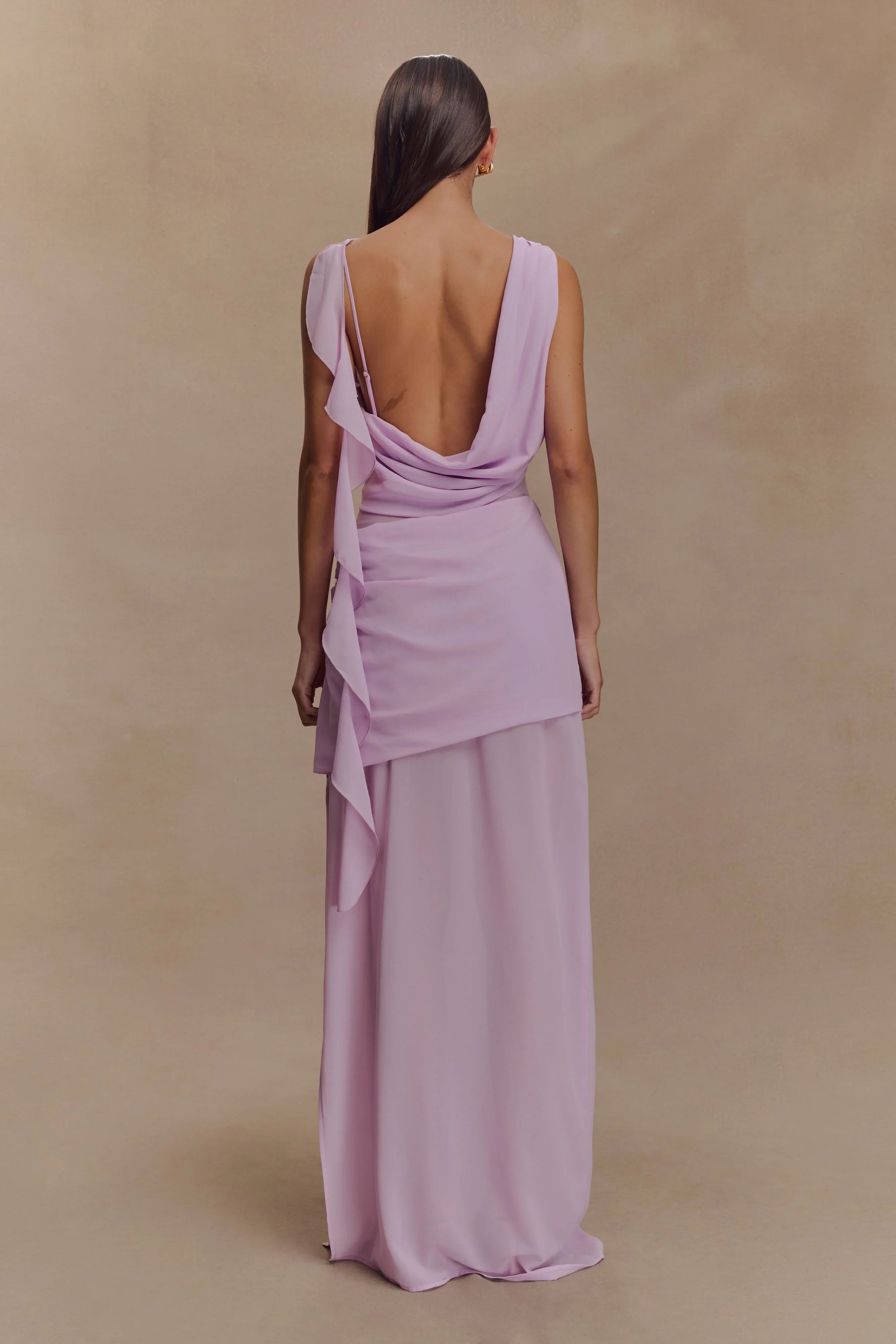 The DARIA Draped Chiffon Maxi Dress is a study in graceful movement and refined drama. Featuring a soft boat cowl neckline and a daring low back, this silhouette is elevated with a cascading drape from the back shoulder and layered chiffon overlays that float at the hip. Fully lined for a smooth fit and finished with an invisible side zip, this dress brings ethereal sophistication to any special occasion.