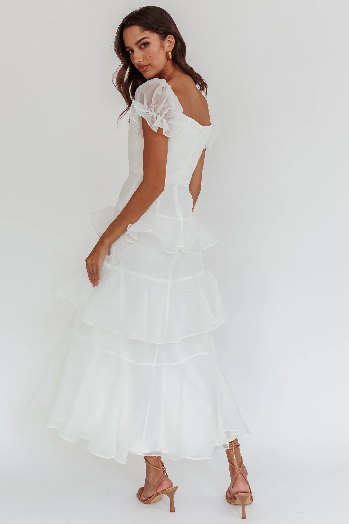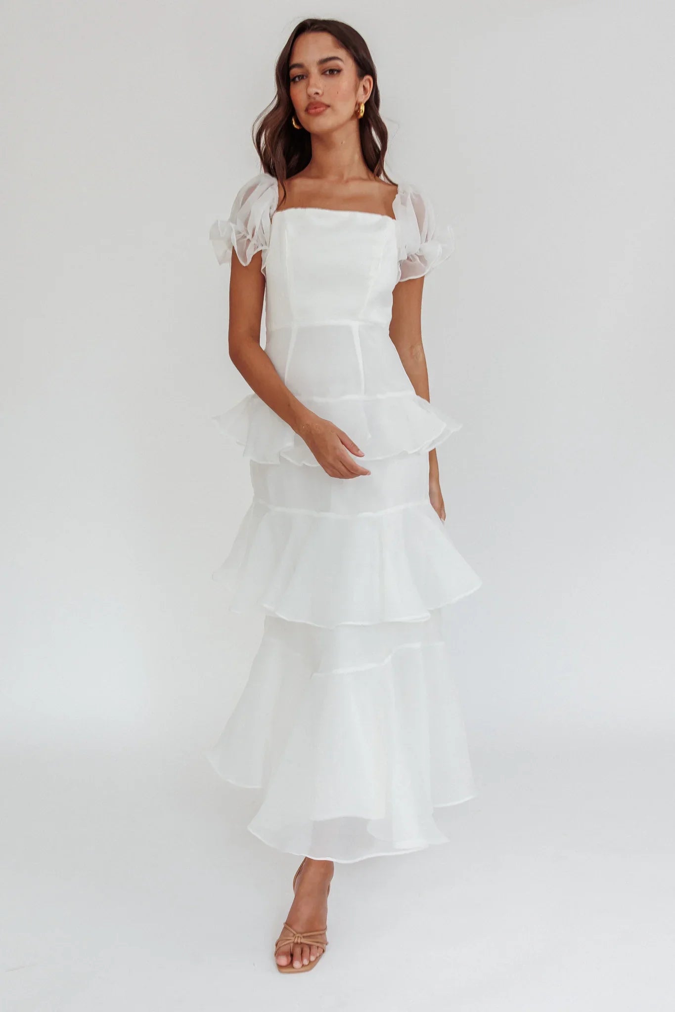 Turn heads in our gorgeous Delwynn midi dress. It features puff sleeves and tiered ruffles and is perfect for bridal events or a birthday brunch with your girls. Team it with strappy, tie-up heels and a clutch for a look that will make jaws drop.