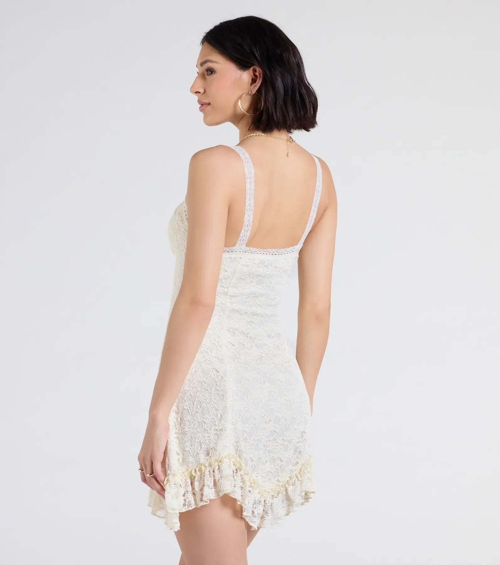Sway to the beat of your fave artist in this lace ruffle mini dress boasting a form-hugging fit and shark bite hem that pairs perfectly with boots!