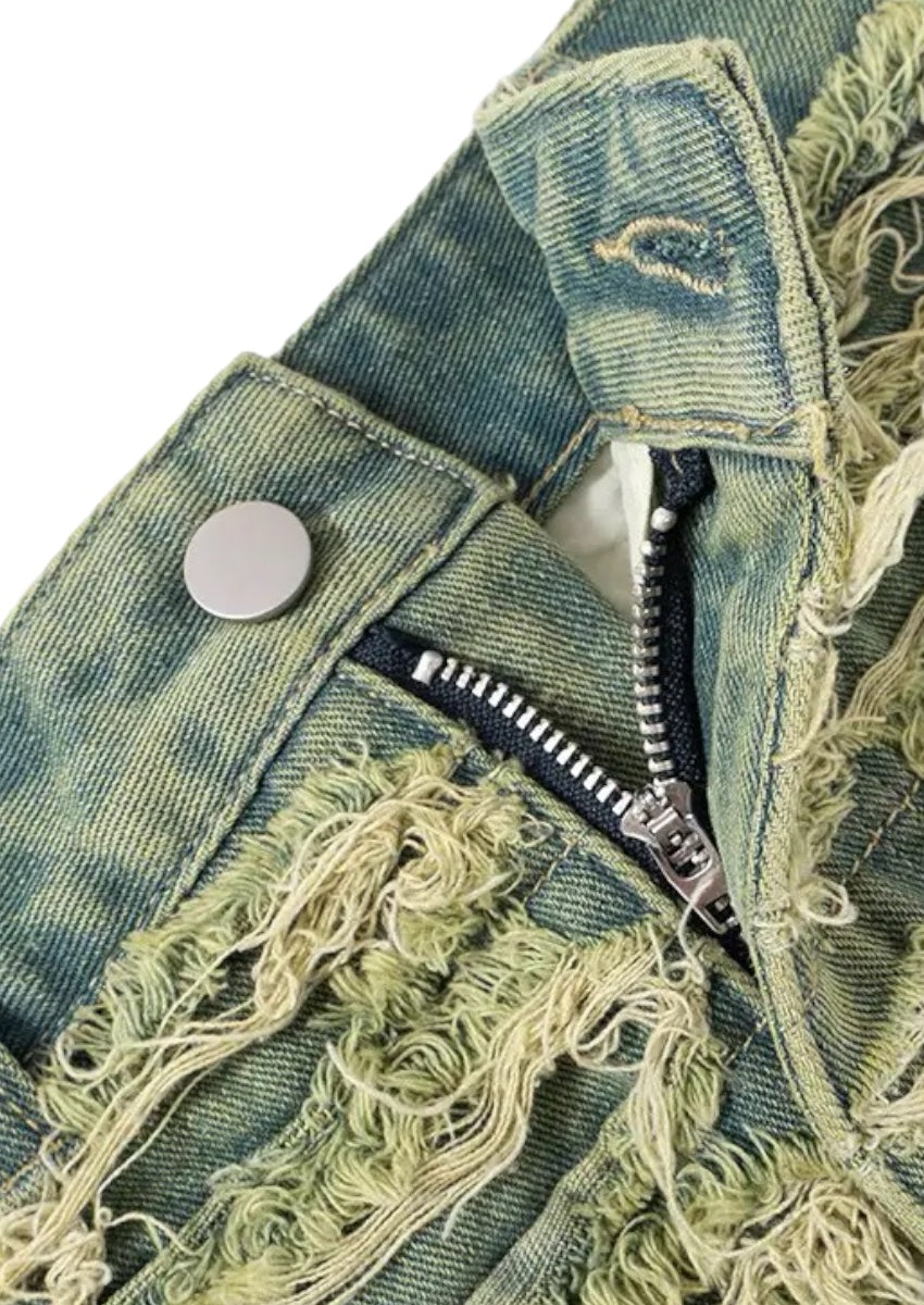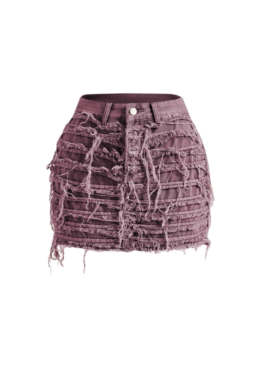 This skirt boasts a chic. edgy look with its artfully frayed hem and strategically placed rips that add a touch of rebellious charm. Made from premium denim. it offers both durability and comfort. making it perfect for all-day wear.