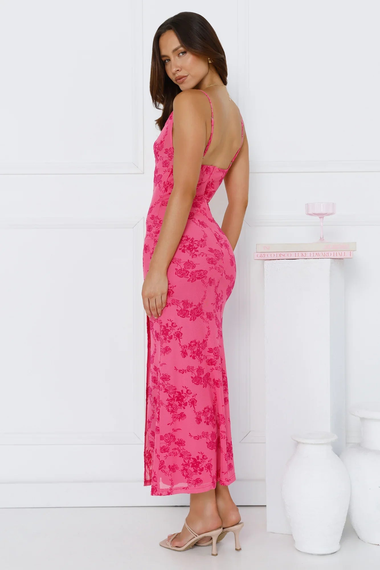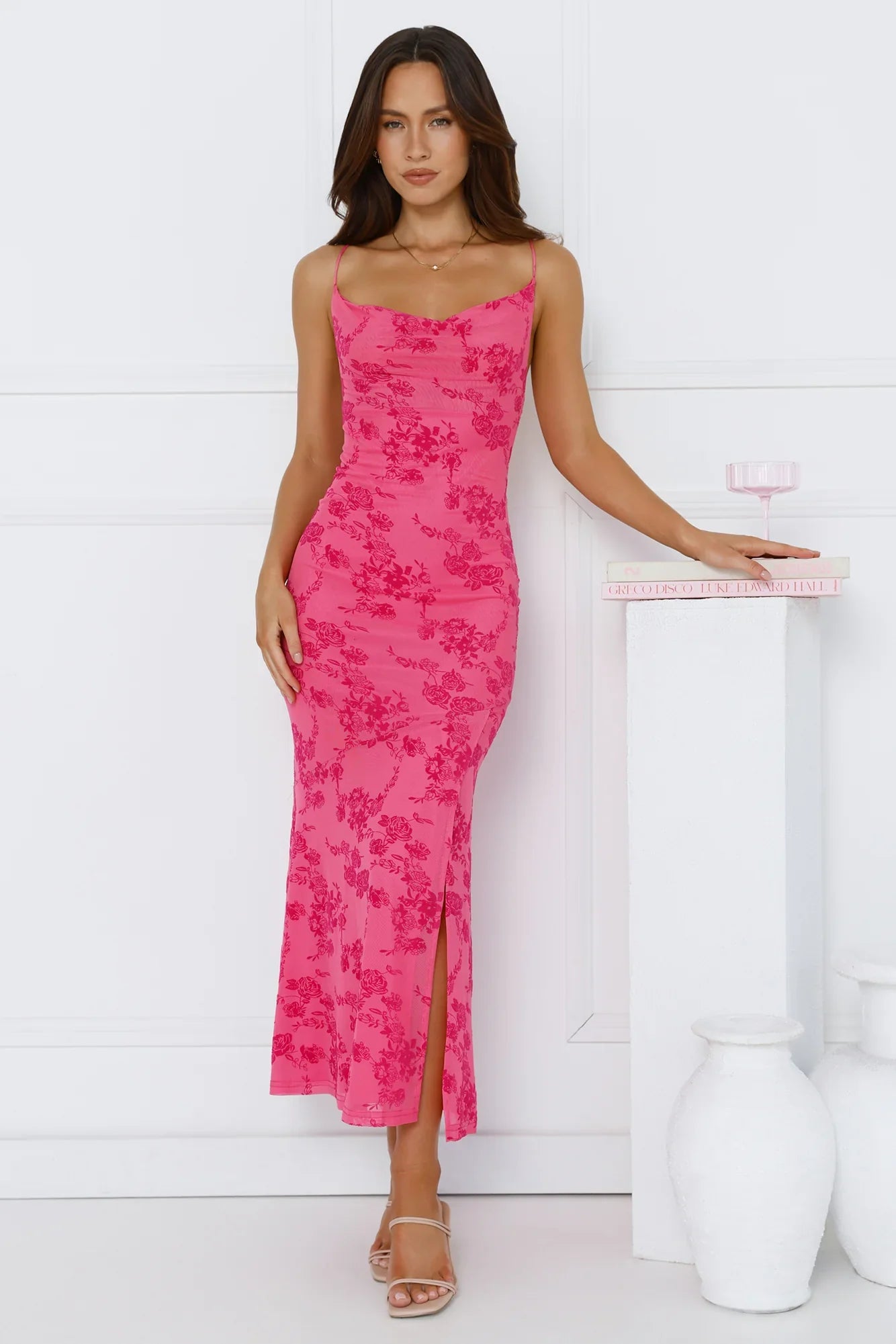 Take on this season's latest trend in style with the Effortlessly Me Mesh Midi Dress! Featuring a cowl neckline and a split to the skirt. Style yours with heels and curls.