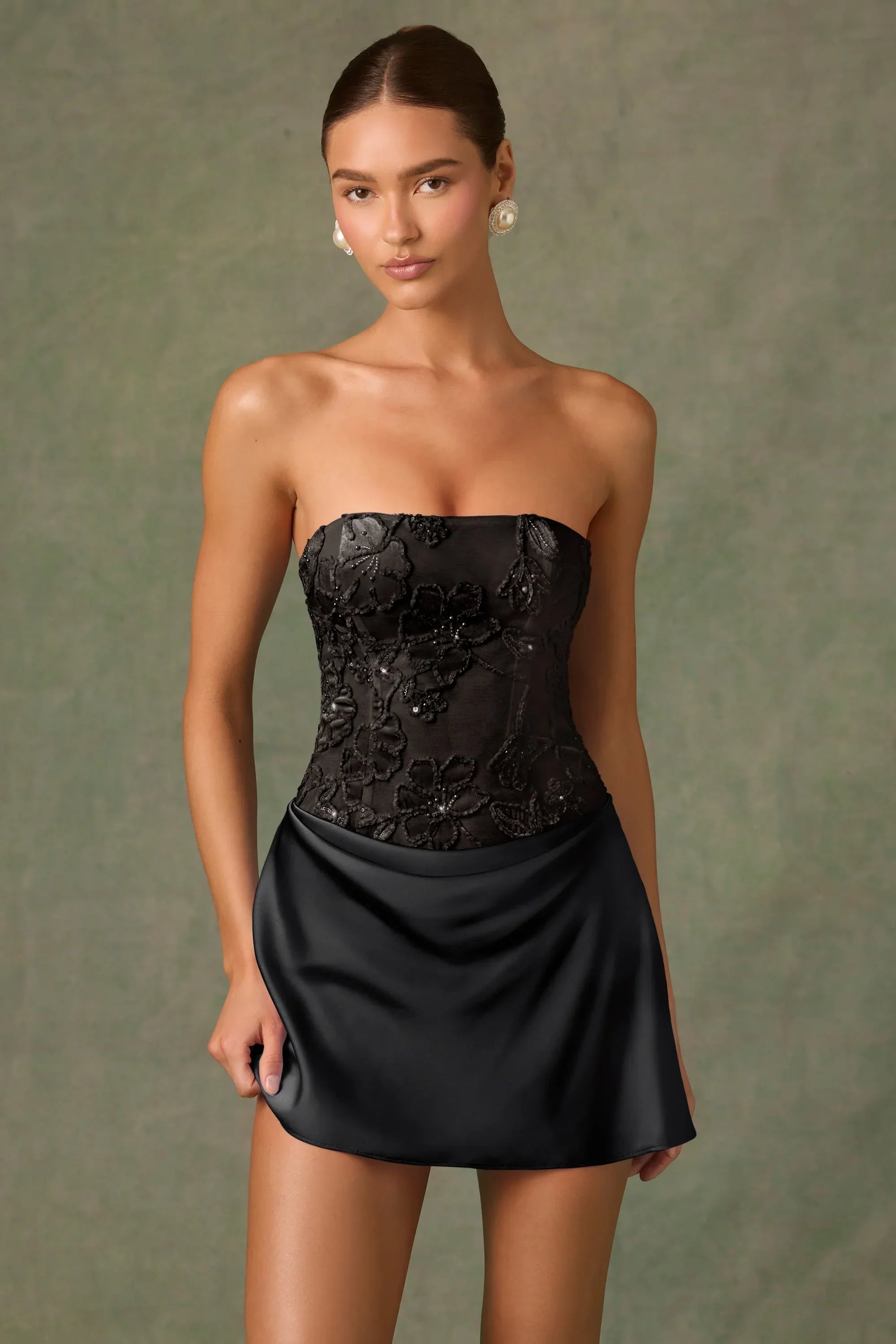 Artful occasion dressing. A runway favourite, the Eden mini dress features an intricate velvet mesh bodice elevated with custom flocked floral appliqués brought to life with tonal sequin embellishments for a touch of sparkle. It’s cut to a universally flattering A-line silhouette with a contrasting draped mini skirt, features a signature corset-inspired back with lace-up detailing and internal silicone grip tape for enhanced hold.