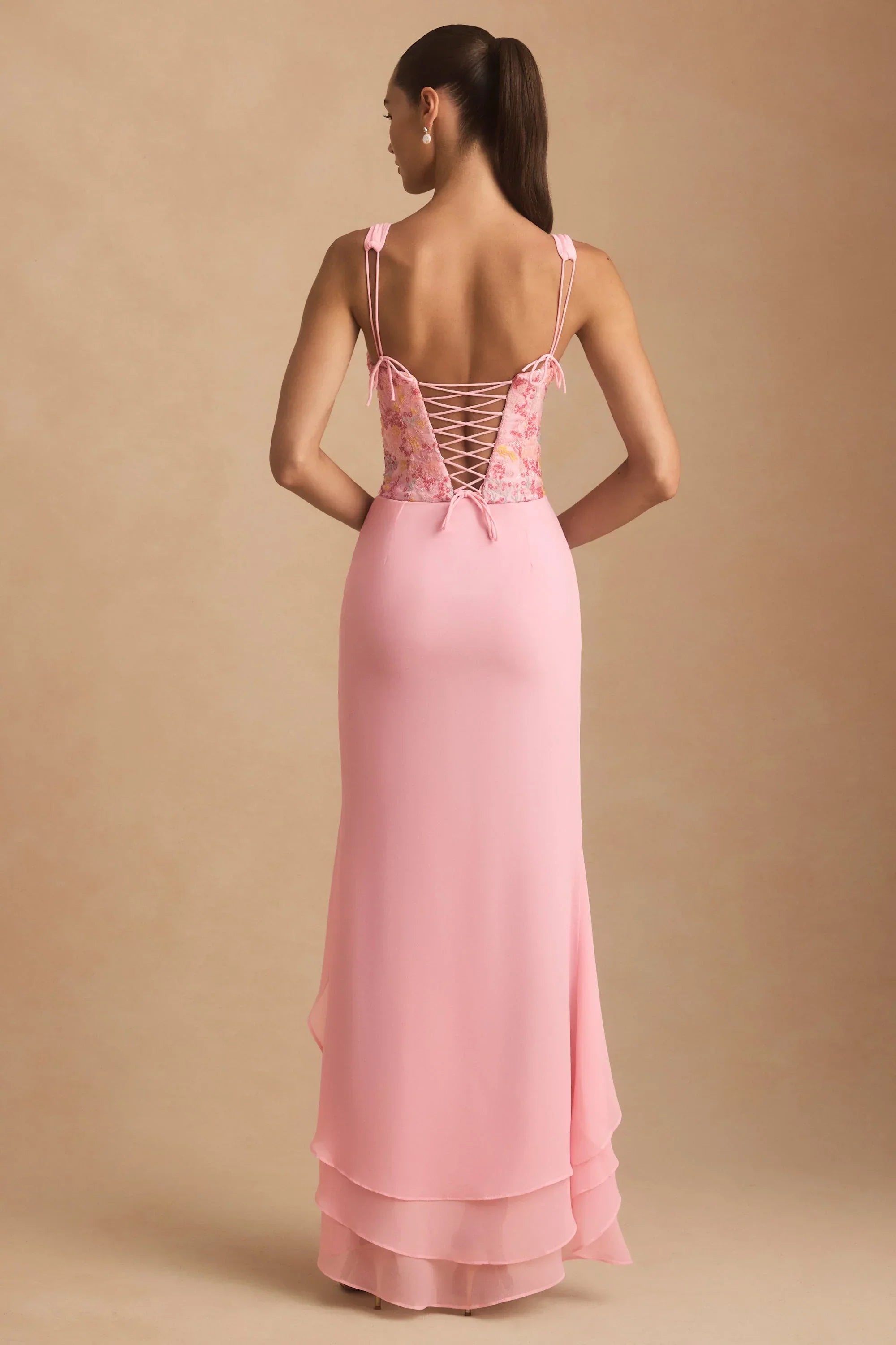Worth making plans for, the Nathalia maxi dress is cut from lightweight chiffon with a plunging V-neckline, waterfall split hem and statement lace-up back. Its overlaid with a waist-cinching corset decorated with coral-inspired embellishments that sparkle under spotlights. The rouleau straps are fully adjustable for your perfect fit.
