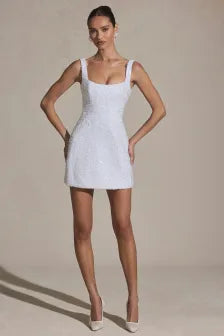Showstopping silhouettes. Embellished with the prettiest pearl and bead embellishments, the Dominique mini dress is perfect for pre and post-wedding events. Crafted from lustrous recycled satin and premium mesh to a structured A-line silhouette, it’s elevated with a square neckline, tapered straps, and a cut-out back complete with adjustable lace-up detailing.