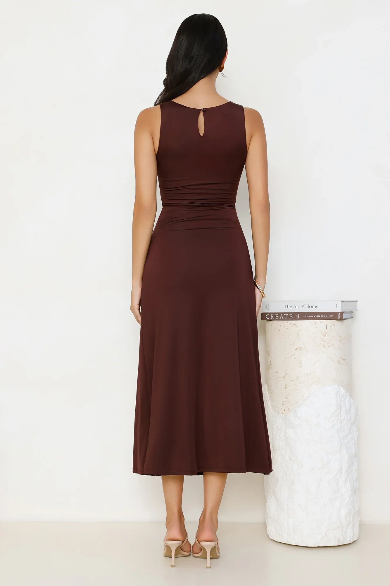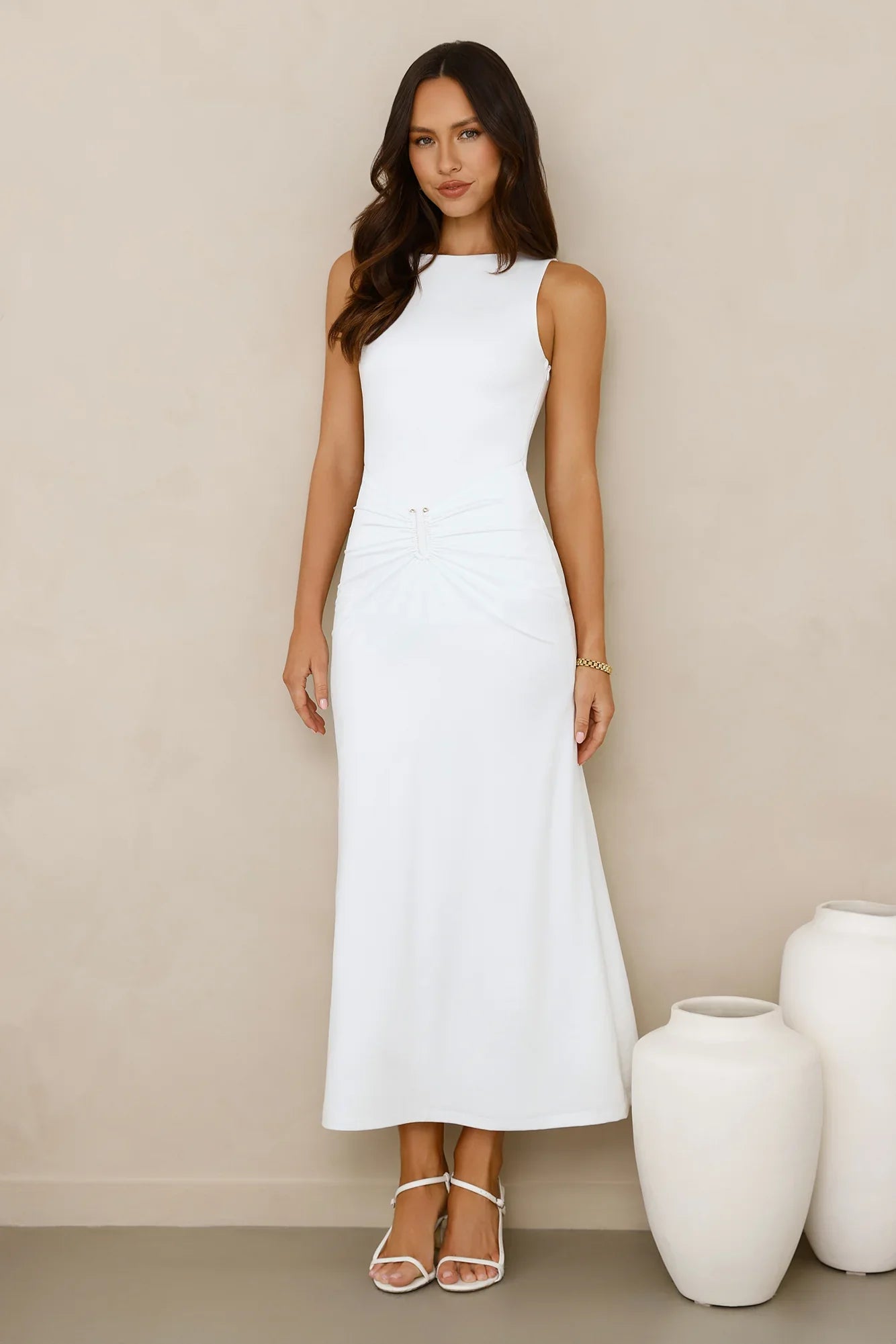 Own the moment in the Everything Energy Midi Dress, featuring a sleek stretch fit, a flattering gathered waist with luxe gold hardware, and a chic button closure at the back of the neck for an effortlessly elegant finish! Style with heels.