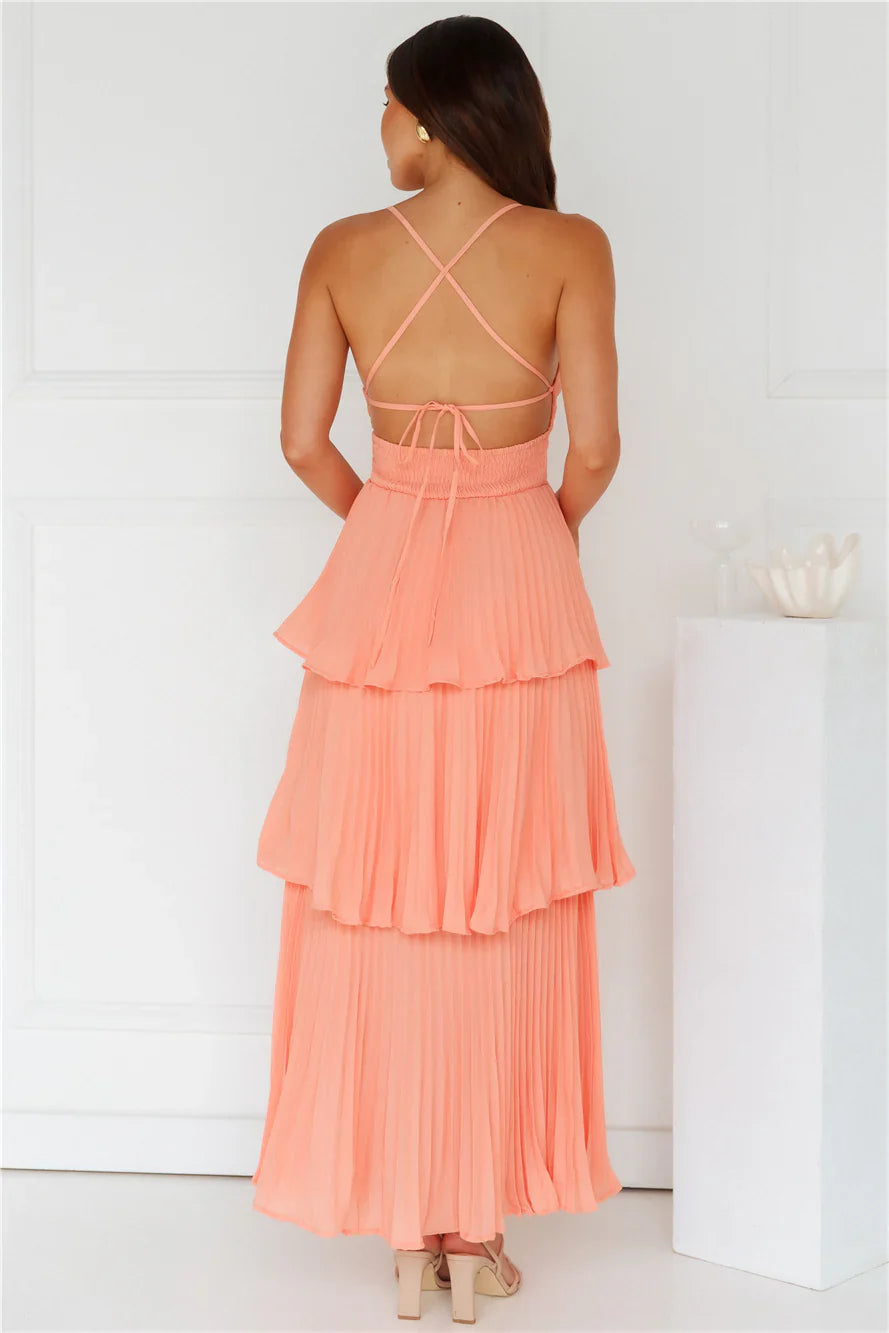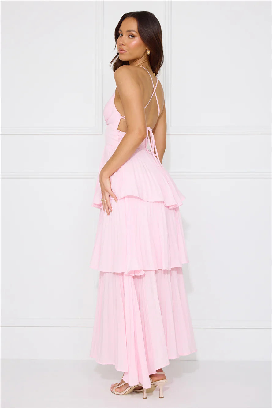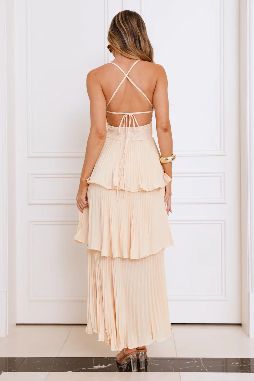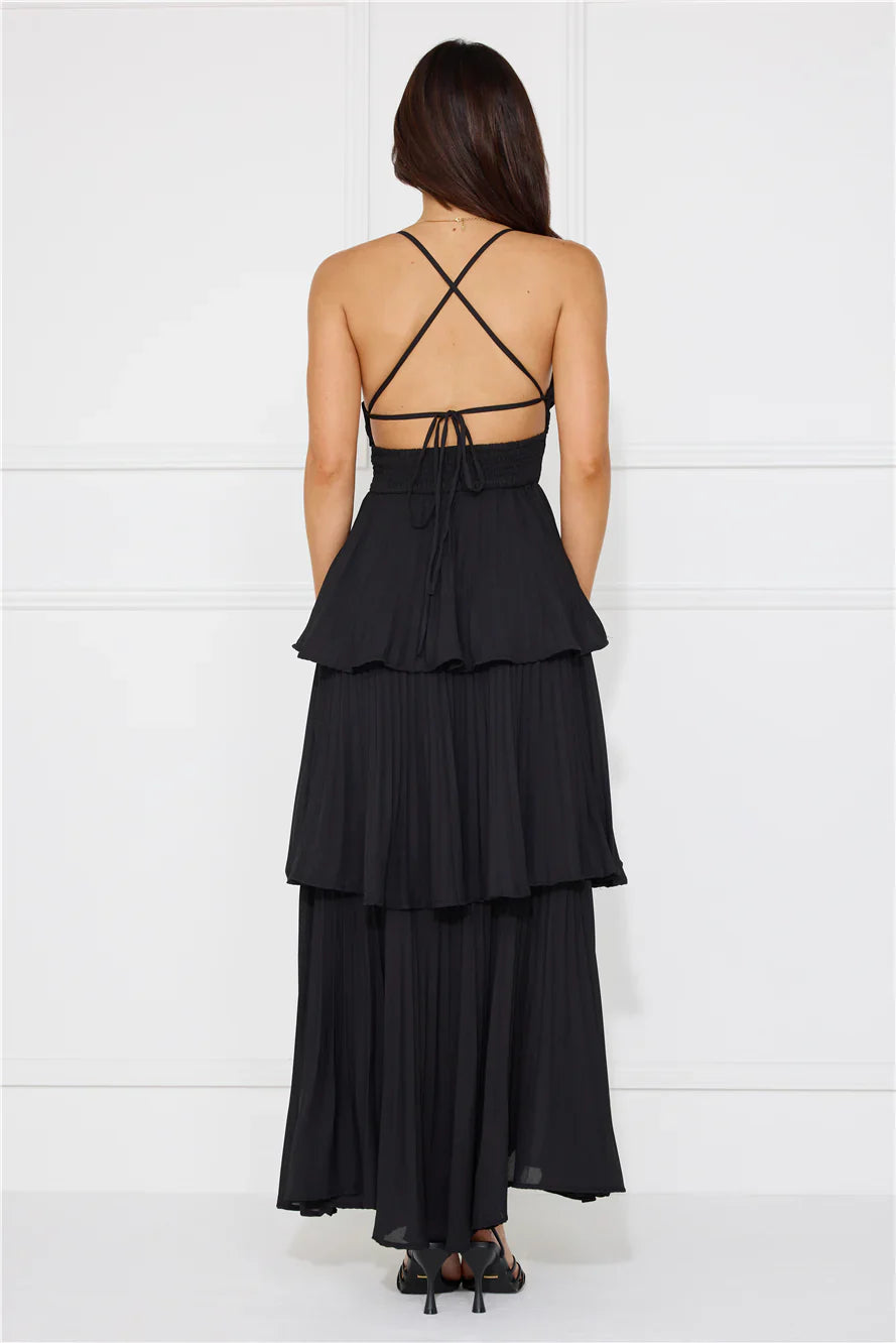 Channel your classy side in the Fashionably Ever After Maxi Dress. Featuring a pleated design, a tiered frill skirt and a crisscross tie-up back. Style with heels for a fancy event.