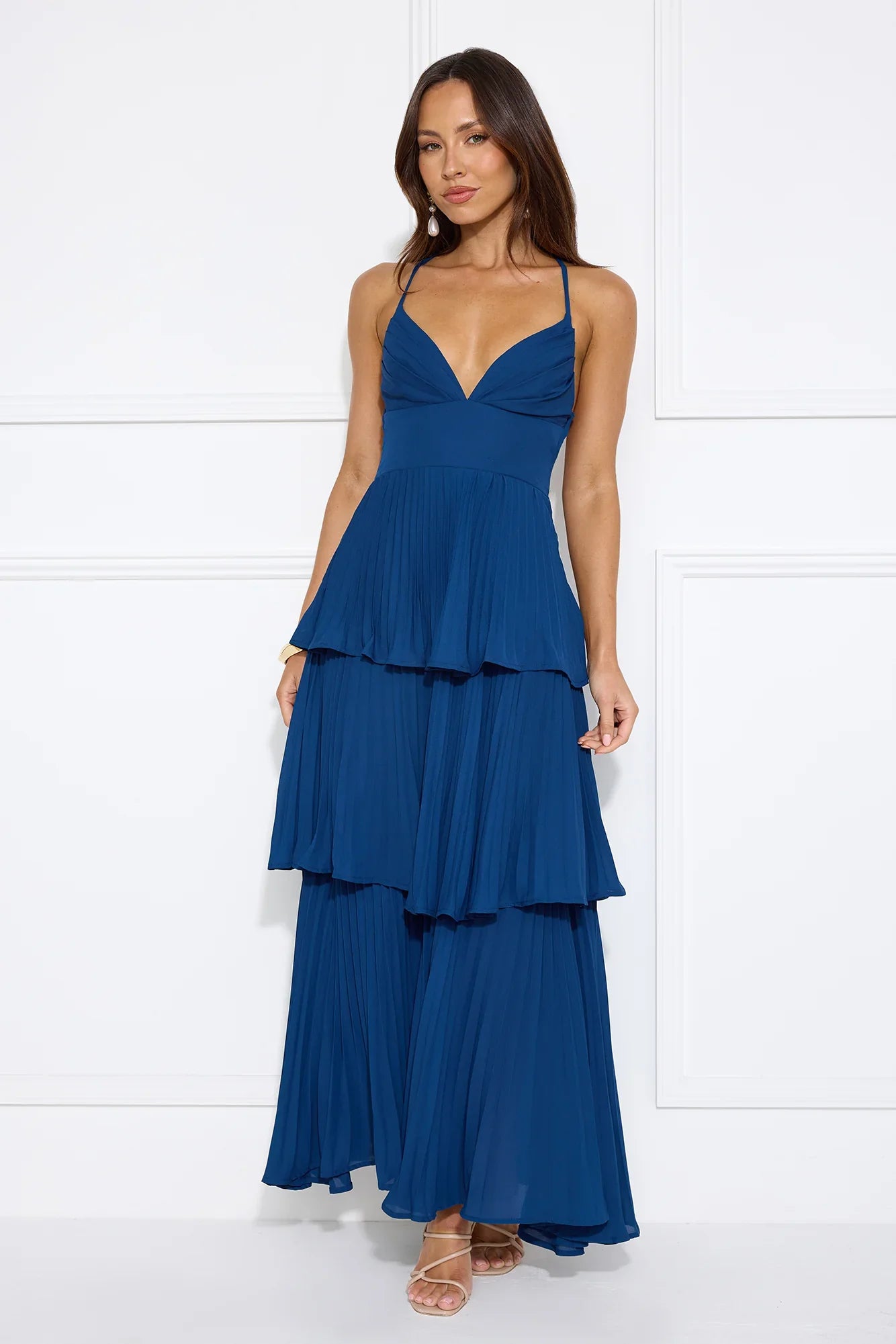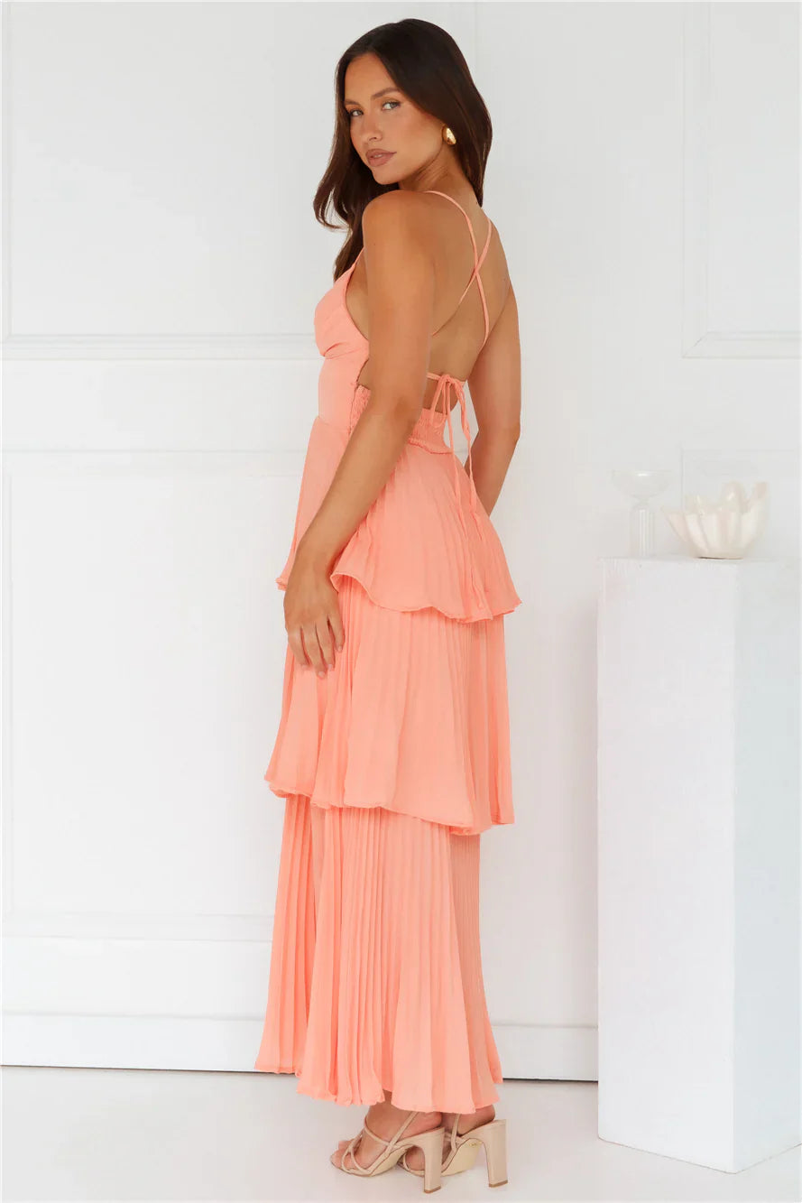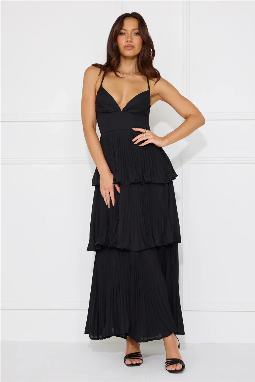 Channel your classy side in the Fashionably Ever After Maxi Dress. Featuring a pleated design, a tiered frill skirt and a crisscross tie-up back. Style with heels for a fancy event.