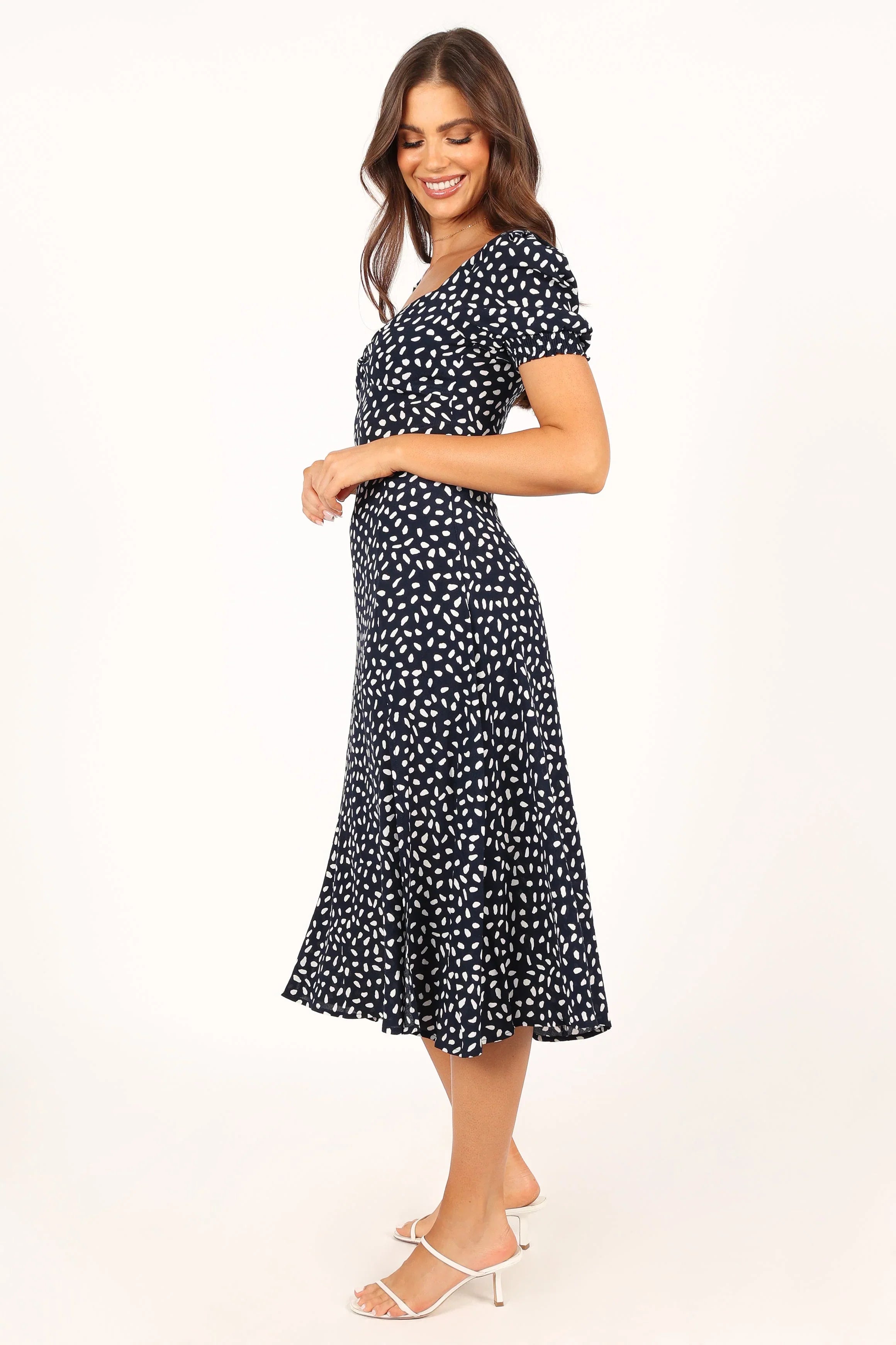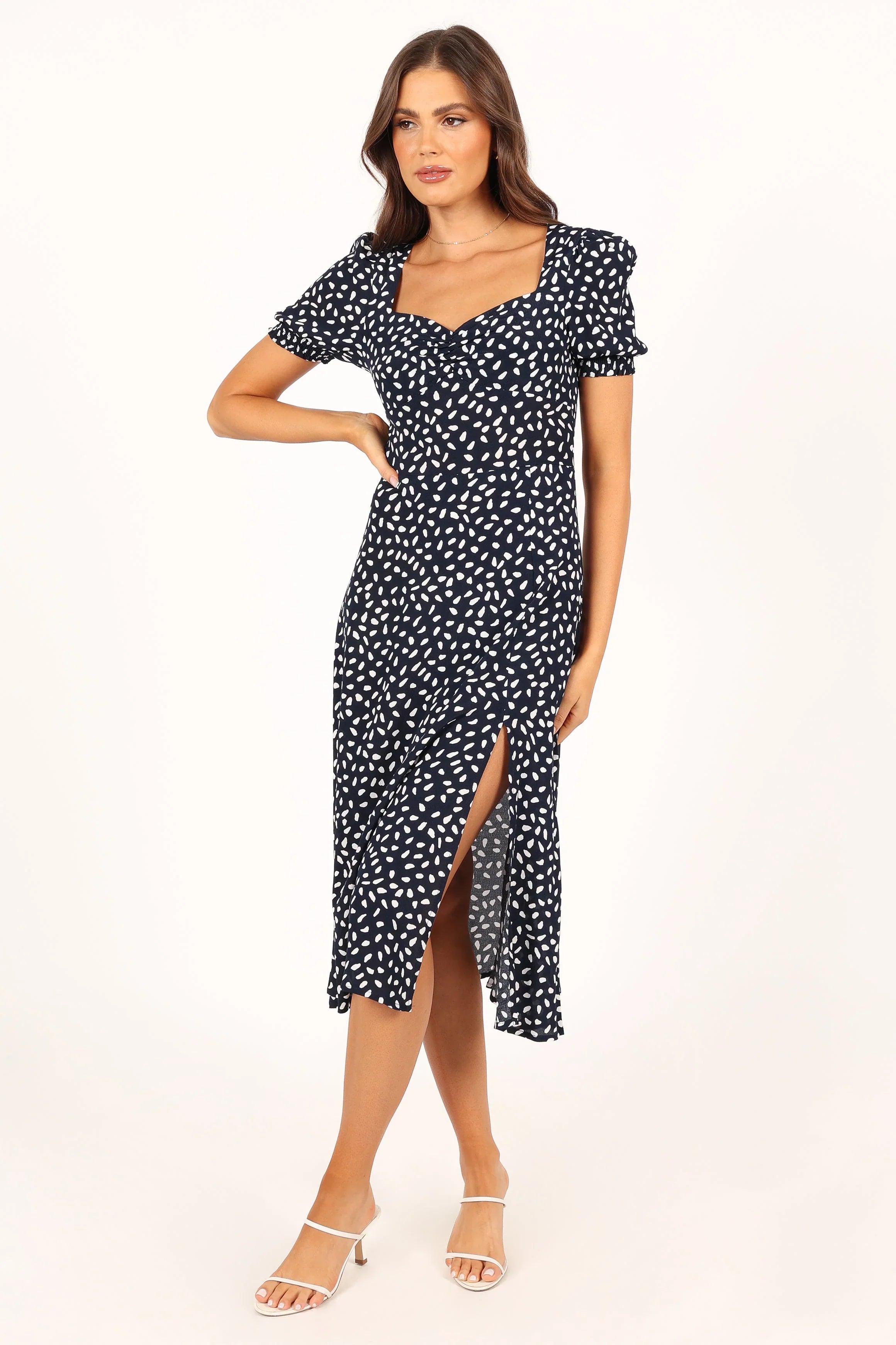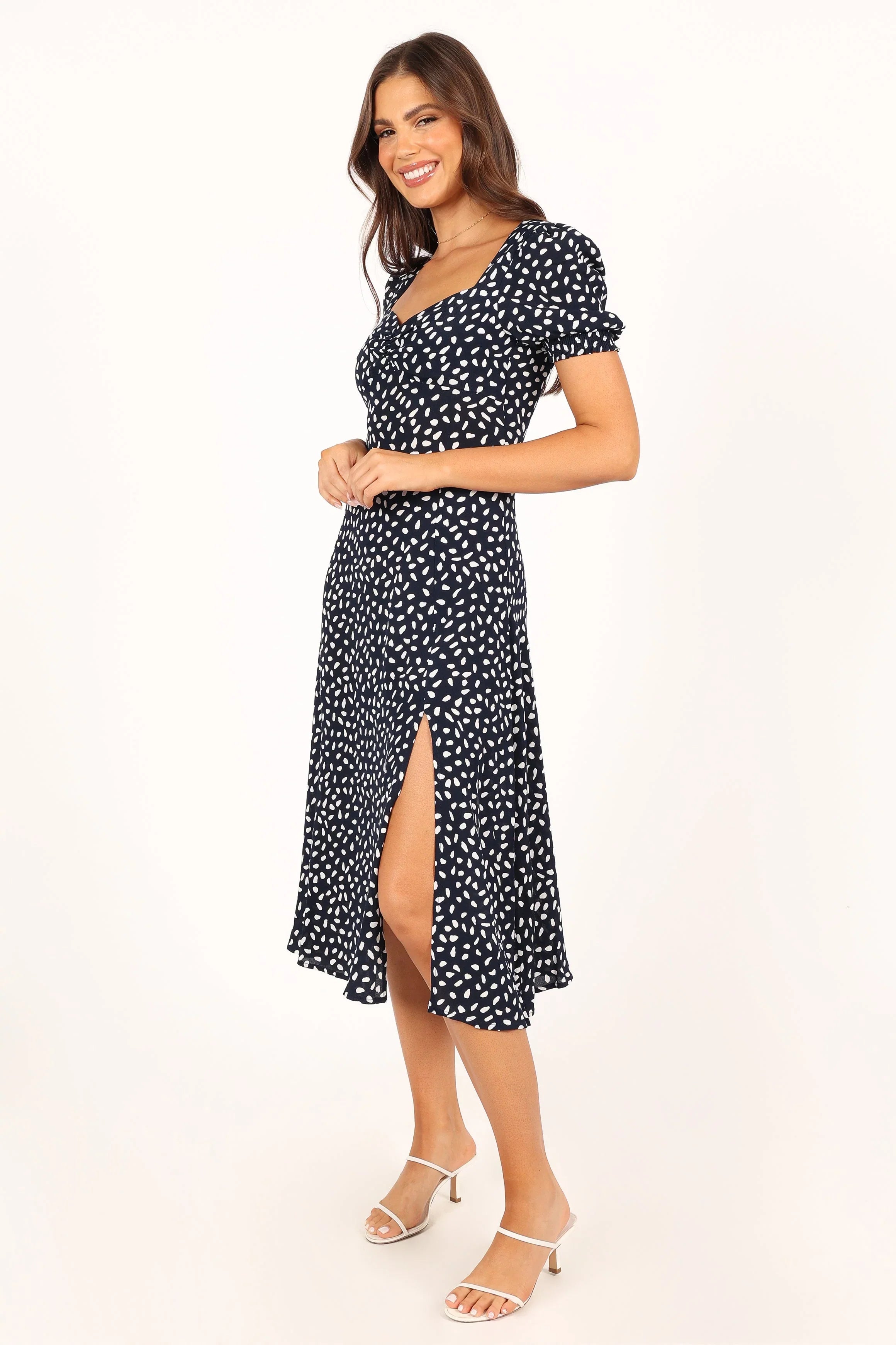 DETAILS This midi dress is a timeless classic with its shirred cuffs and round neckline. The ruched bust detailing adds an elegant touch, while the front split gives you a bit of extra movement for maximum comfort.