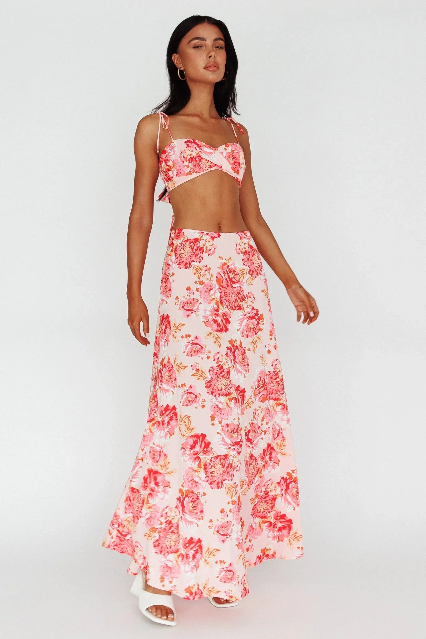 Make an entrance in our gorgeous Gabbi maxi skirt. Featuring a pretty floral print, it's perfect for dinner with your girls. Team it with its matching crop top and diamante heels for a look that's fit for a princess.