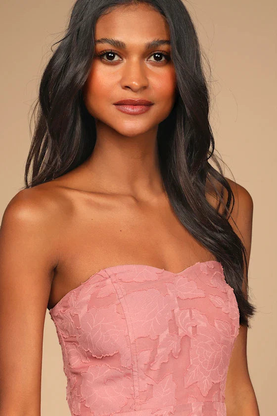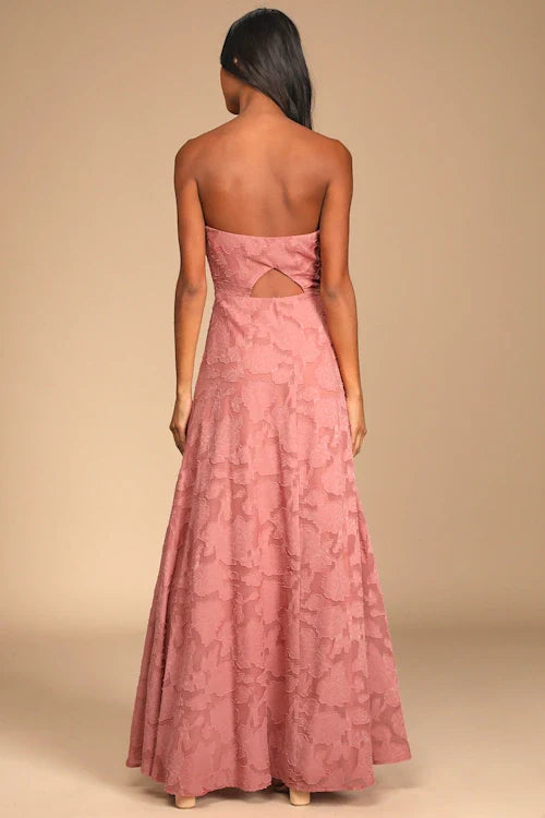 You understand the assignment every time, and this strapless chiffon maxi dress proves it. The princess-seamed bodice features a sweetheart neckline (with no-slip strips) and supportive side boning, all atop an A-line skirt with a flirty side slit. A floral burnout design throughout makes this dress ideal for any spring soiree. Hidden back zipper/clasp.