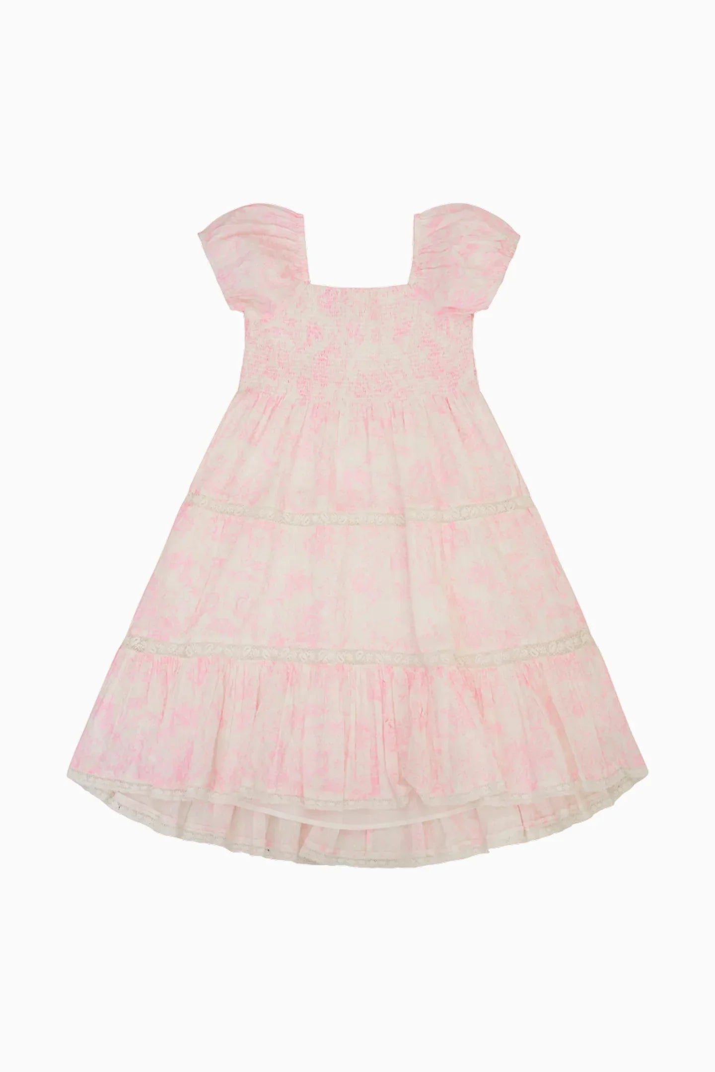 Our minis are so sweet in the Muriella Dress. This charming dress features our new pretty pink print of the season. With short flutter sleeves, the airy dress is finished with a sweepy skirt.