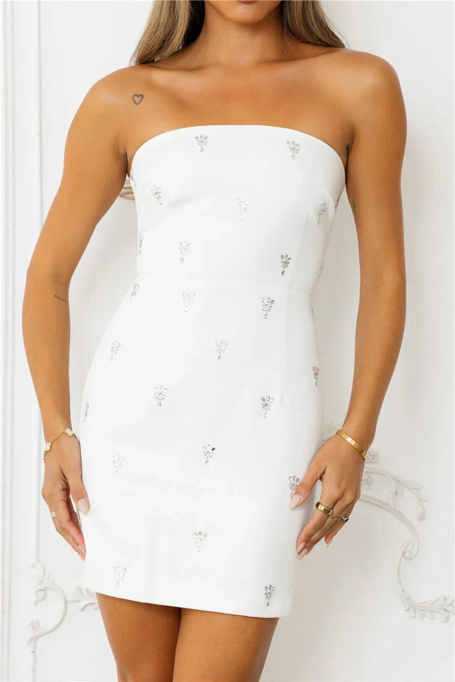 Shine all night in the Glimmer Glow Strapless Mini Dress, featuring a chic strapless design and dazzling embellishments for the ultimate glam look! Style with heels.