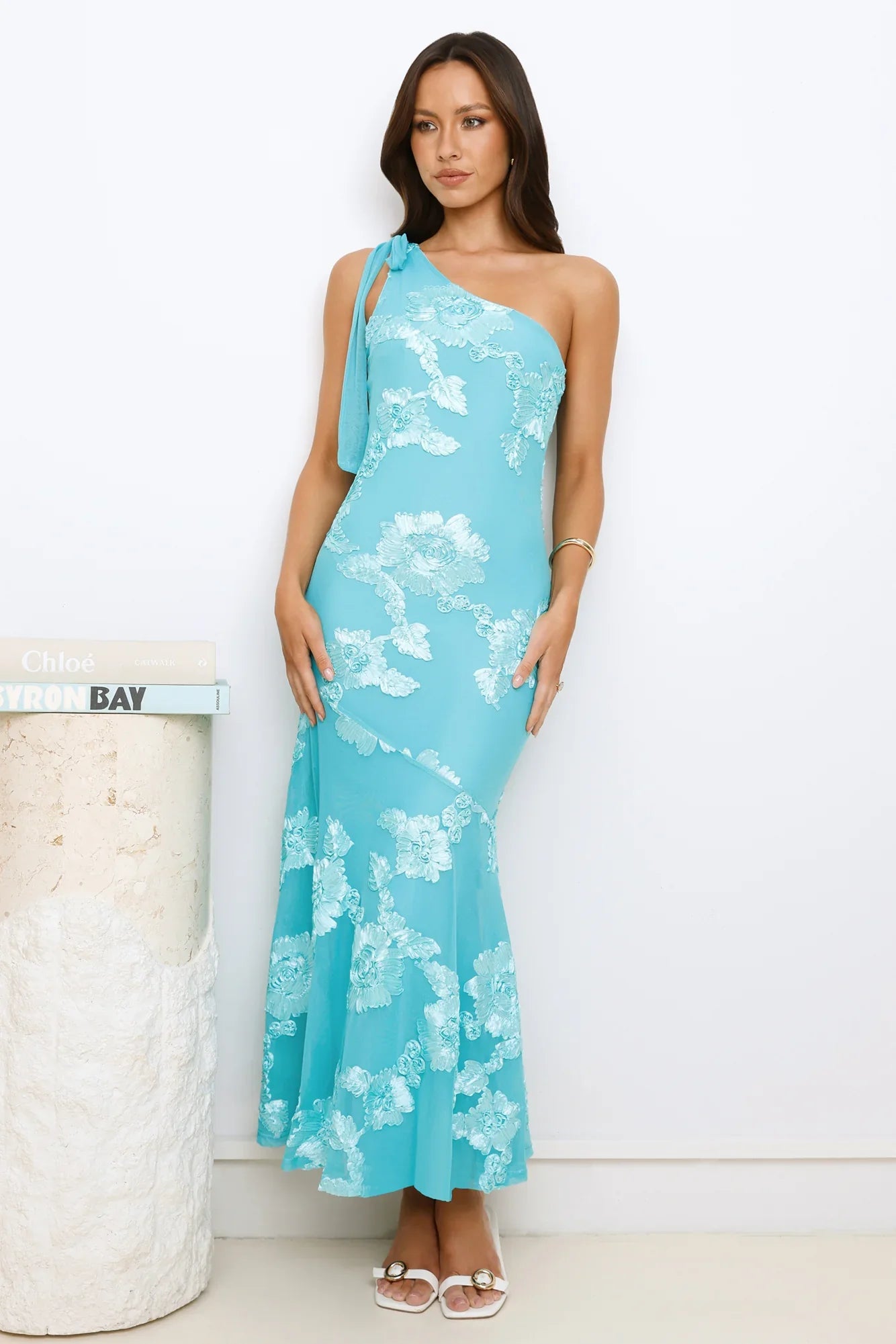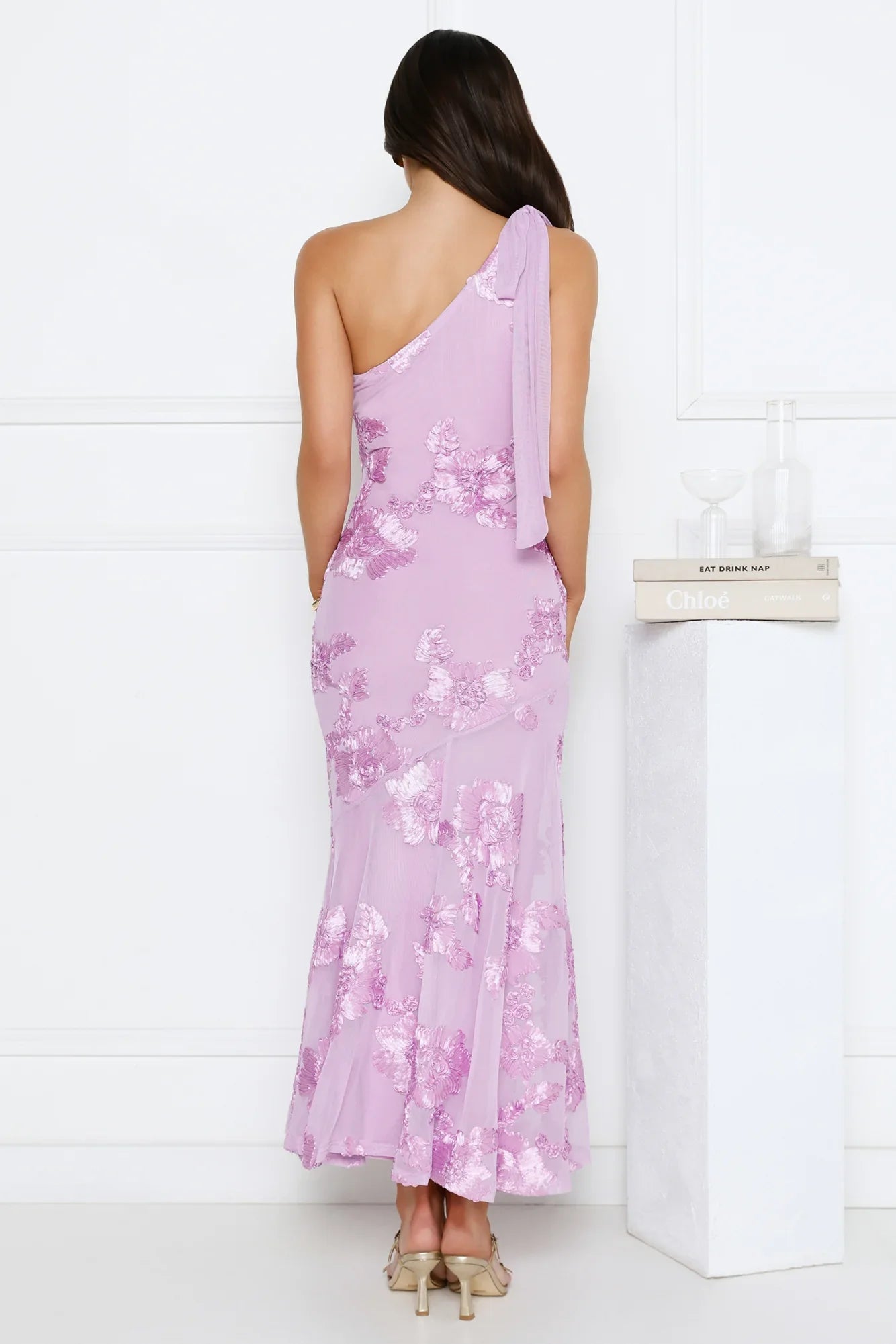 Isn't she gorgeous? The Glossy Girl One Shoulder Mesh Maxi Dress is guaranteed attention. It features a mesh silhouette with embroidered details, a tie to the shoulder and a flowy skirt. Style with heels!