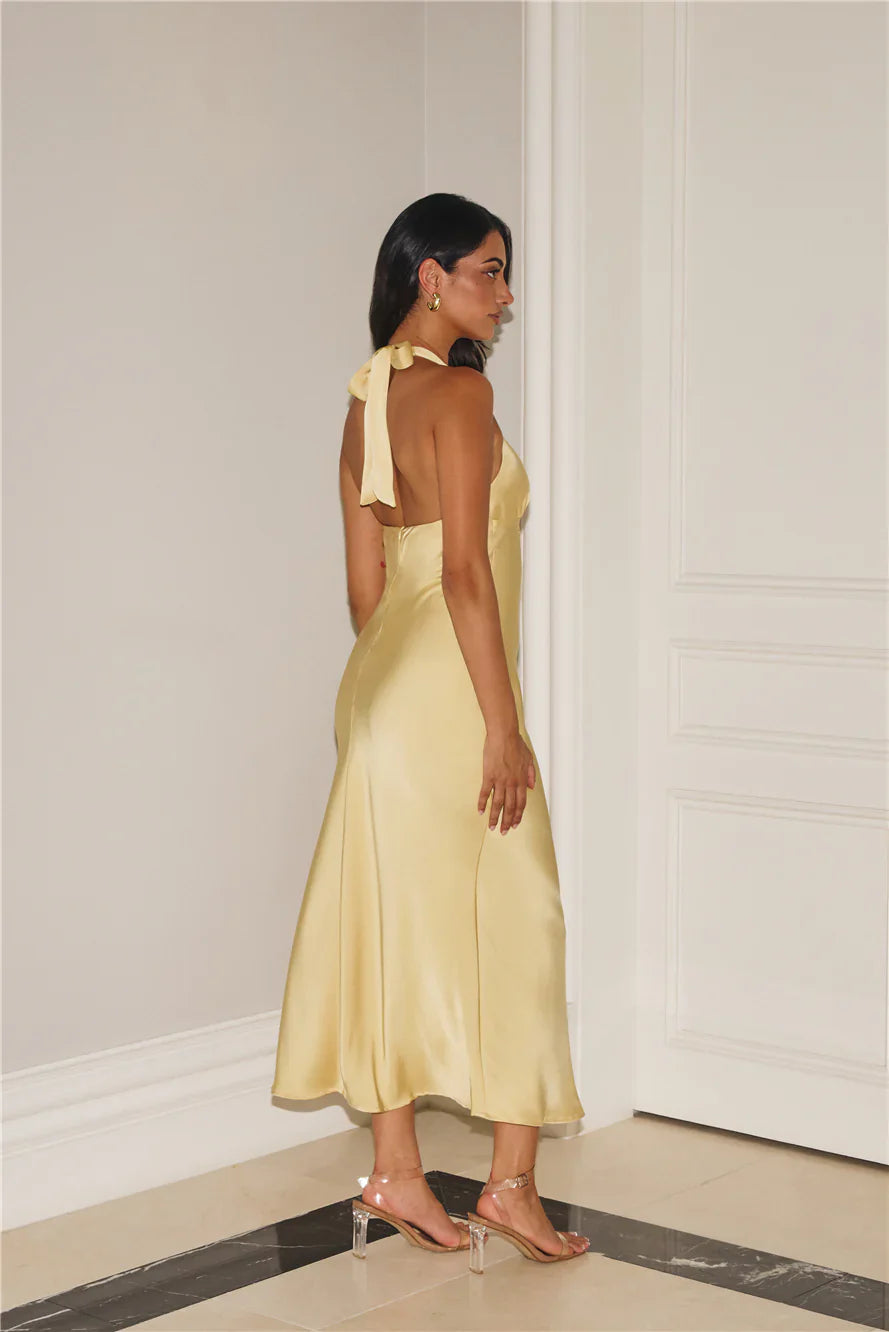 All the attention will be on you, lovely. The Gold Romance Halter Satin Maxi Dress features a silky satin silhouette, a halter neck tie and gold flower hardware. Style with heels to impress.