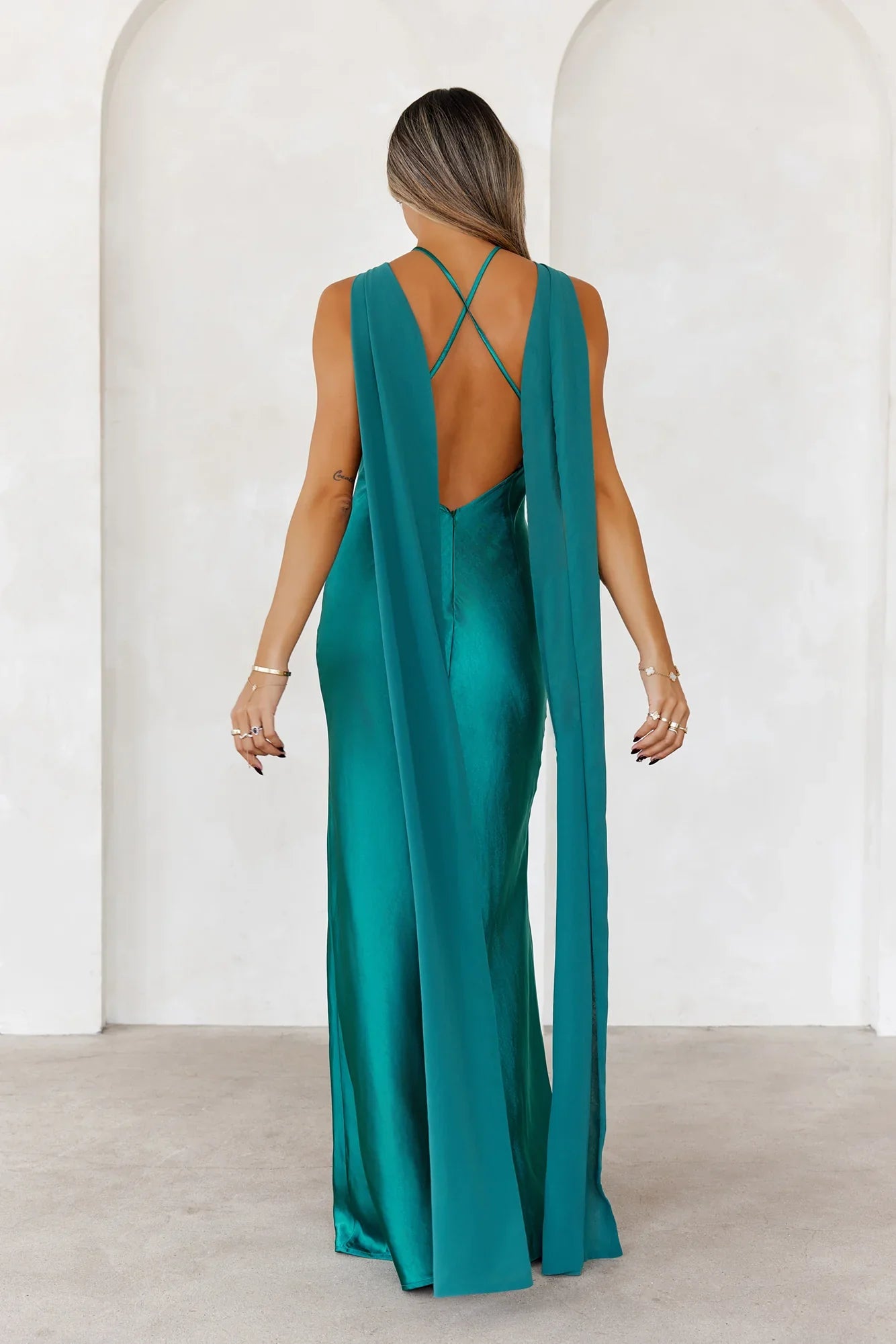 Steal the attention in this exclusive silhouette. The Golden Empress Satin Maxi Dress features a silky satin design with a high neckline and a train detail to the back. Style with heels for an extravagant 'fit!
