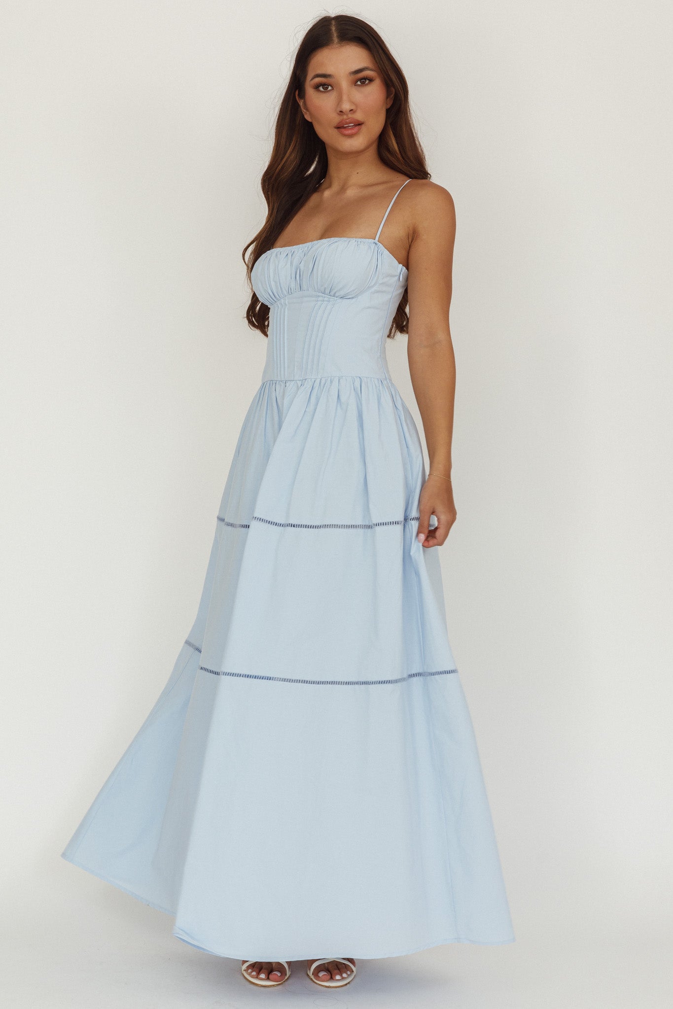 Step into your fairy tale with our enchanting Heavenly Glow maxi dress, a vision of romance and elegance. This dress flows effortlessly, creating a graceful silhouette that's perfect for a special day. It features a flattering gathered bust, adding a touch of timeless charm. Finish the look with kitten heels and a tote.