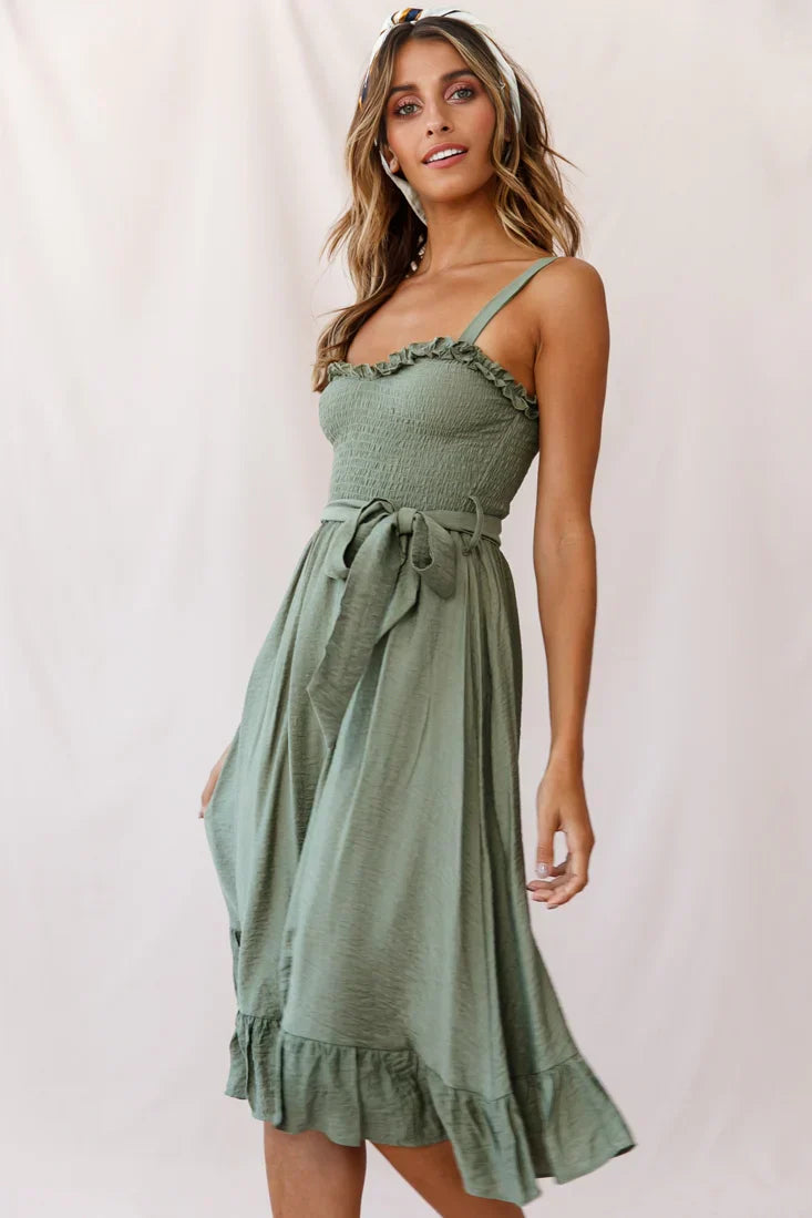 As sweet as honey! We are in love with this breezy dress, perfect for a sunny day picnic with your girls or strolling the markets looking for vintage treasures. Featuring a frill-trimmed shirred bust, A-line skirt and separate waist belt. It would look super cute with a straw tote and leather sandals or dress it up with some mules and layered, gold coin necklaces for an on-trend look.
