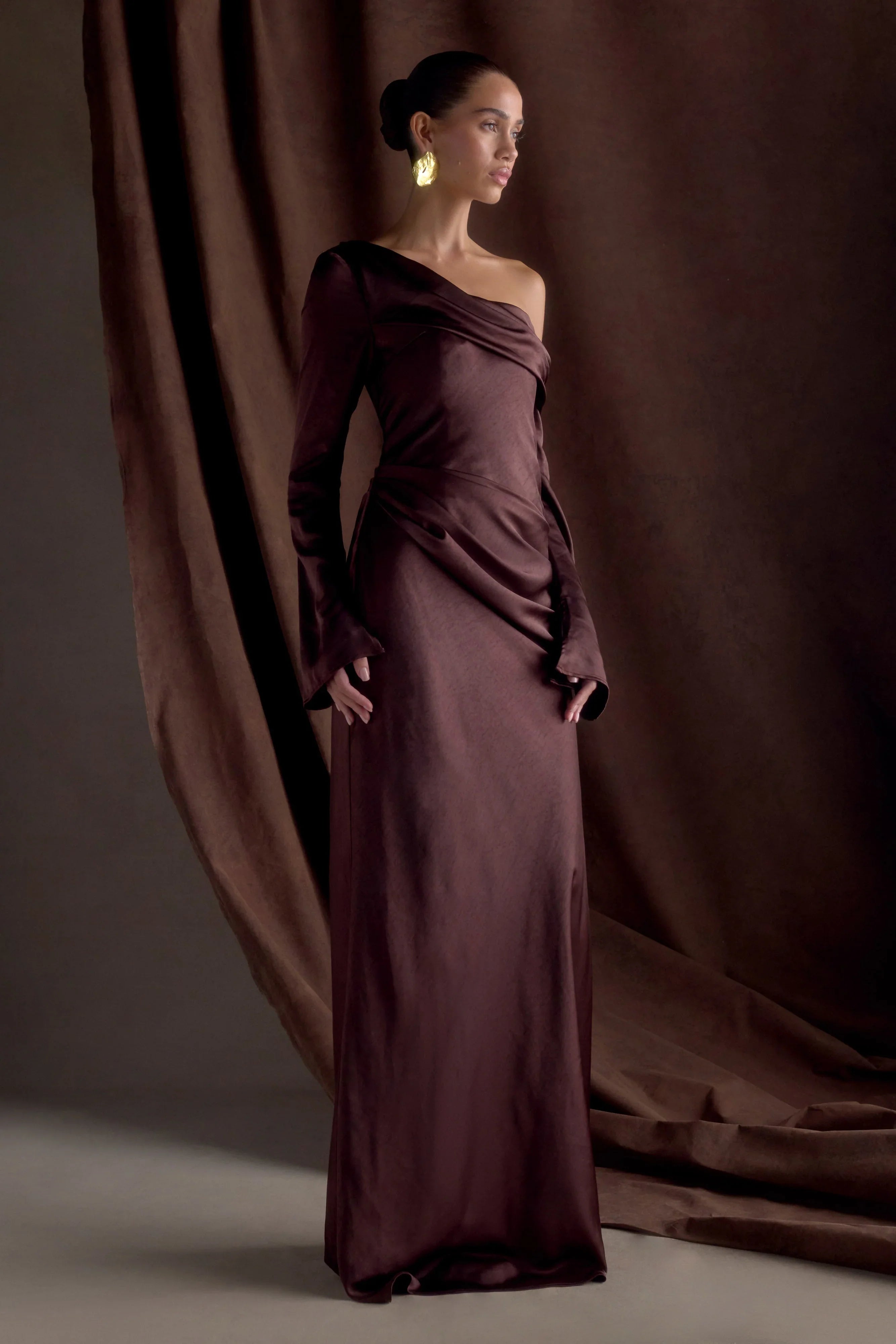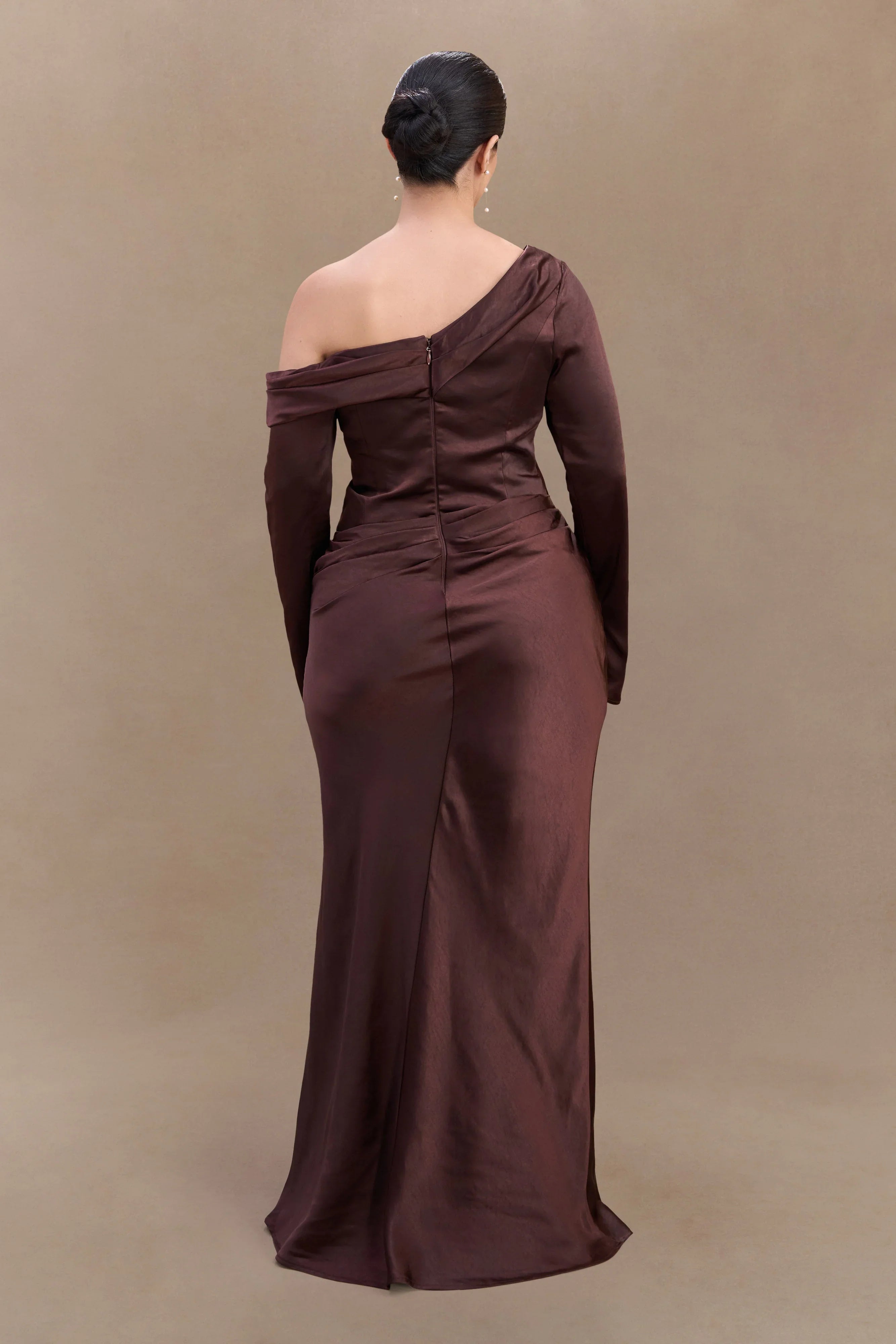 The IRIS Long Sleeve Satin Maxi Dress is a statement of refined elegance. Designed with an asymmetrical neckline and a gathered bust overlay, this silhouette drapes beautifully while enhancing the figure. The fitted, boned bodice provides structure and support, while the gathered hip detail adds soft dimension. A flowing maxi-length skirt completes the look with effortless grace. Finished with an internal elastic waist stay for a secure fit and a back zip with hook-and-eye closure, the Iris dress is perfect for formal occasions, black-tie events, and unforgettable moments.