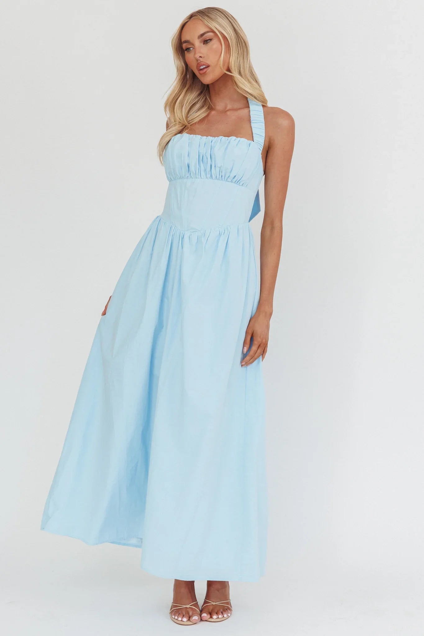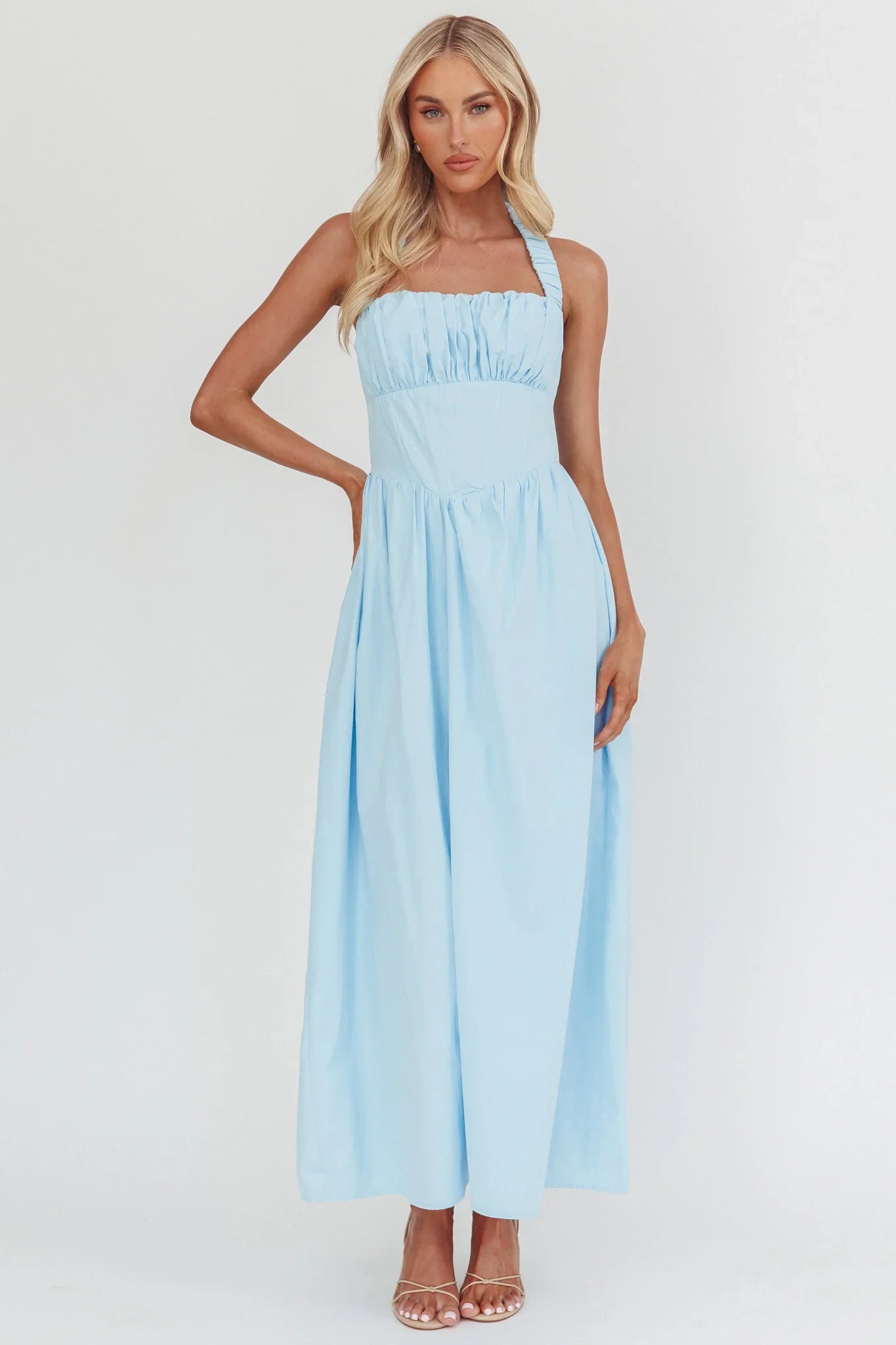 Hello, gorgeous! You will turn heads in our adorable Irisa maxi dress. It features a halter neckline and gathering in the bust and is perfect for a romantic date night. Team it with kitten heels and a tote for a look that will have everyong asking you, "Where'd you get your dress?!"