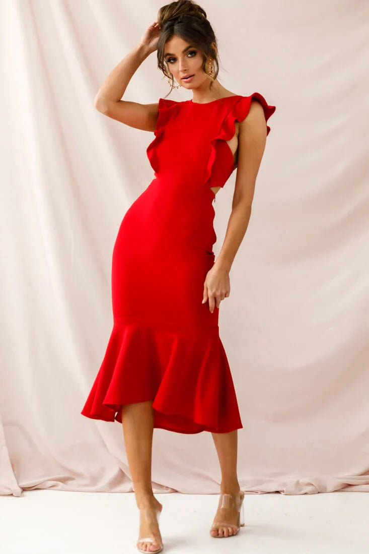 Okay girl, we see you! Own every room you walk into in our Jackie dress. Classy, sassy and a little bad-assy, this structured, pinafore style mid-length dress is balanced perfectly by the wide ruffle, high-low hem and ruffle straps. In addition to hugging you in all the right places, we are loving the little peek-a-boo cutouts at the waist that continue around to the back to give a two-piece illusion. Team it with chunky gold jewelry and a bold lip and we can guarantee they won't be forgetting you too easily. Icon!