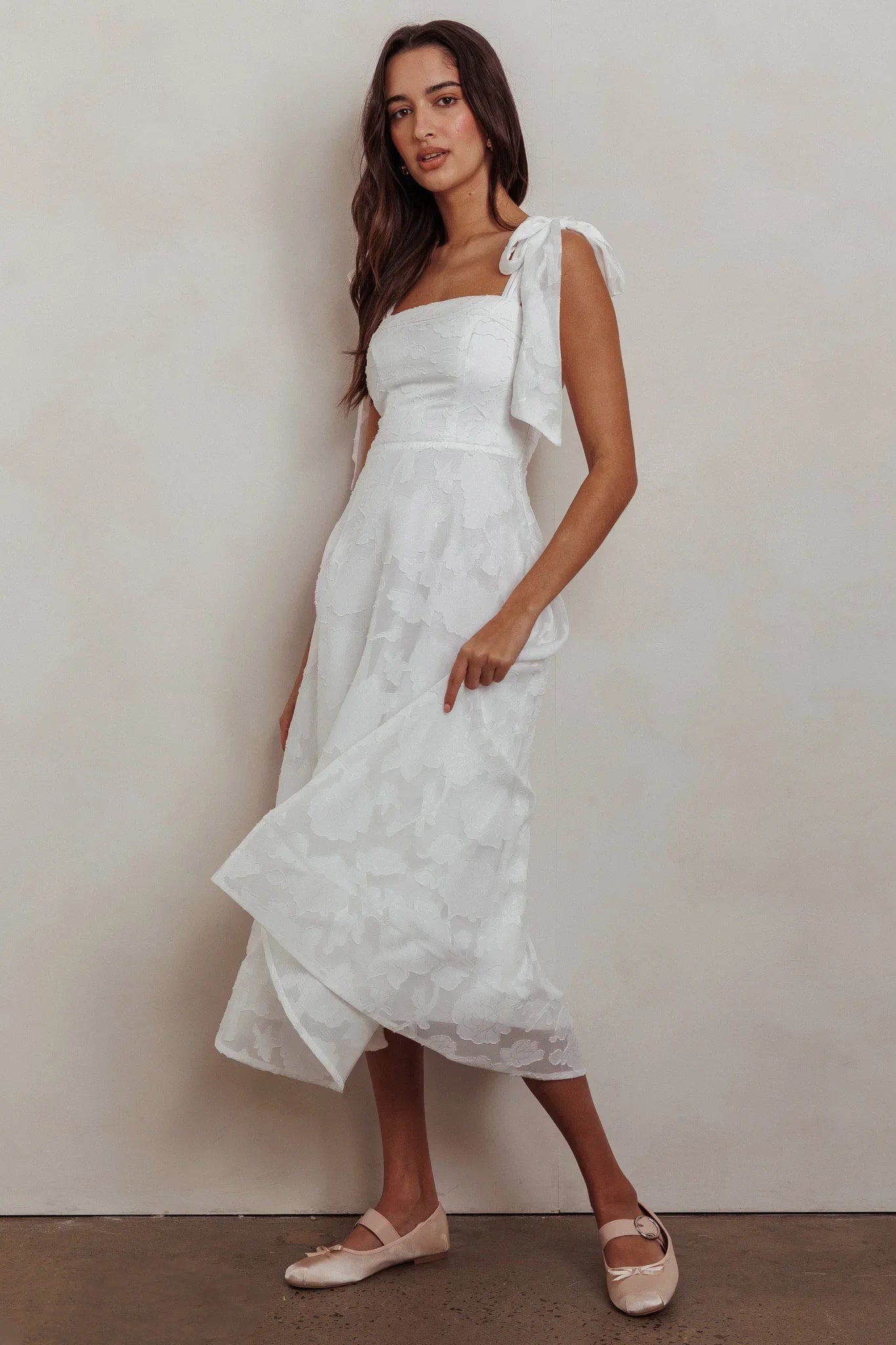 Hey there, cutie! You'll feel like a princess in our pretty Jeanie midi dress. Featuring a classic A-line cut and tied shoulder straps, it's perfect for weekend brunch with your girls! Team it with sandals and a tote for a stylish look we are loving.