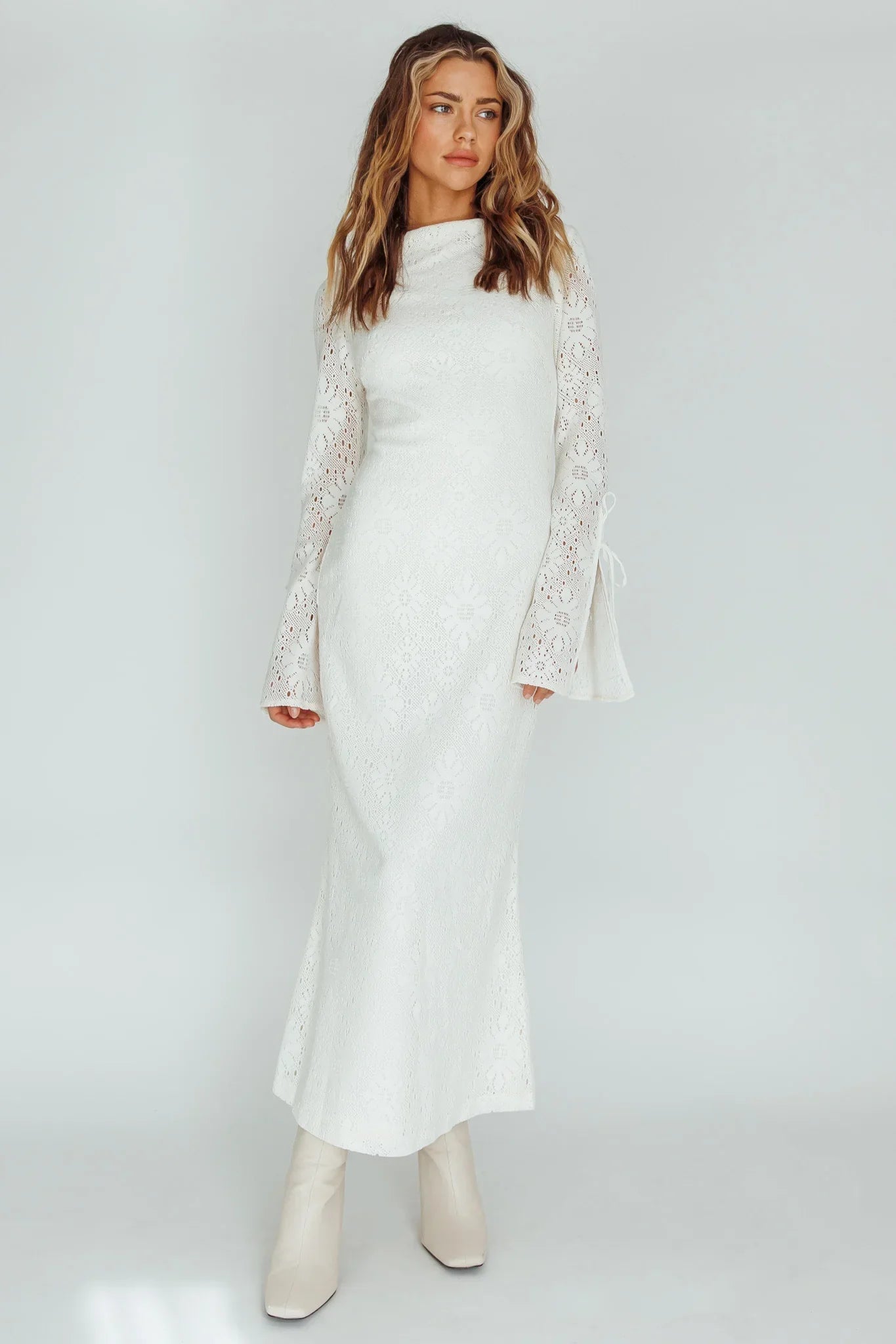 Steal the show in our gorgeous Kalia midi dress. Perfect for the modern bride or a romantic date night. We are in love with its lace fabric and tie detail in the sleeves. Team it with nude heels and a clutch for an unforgettable look.