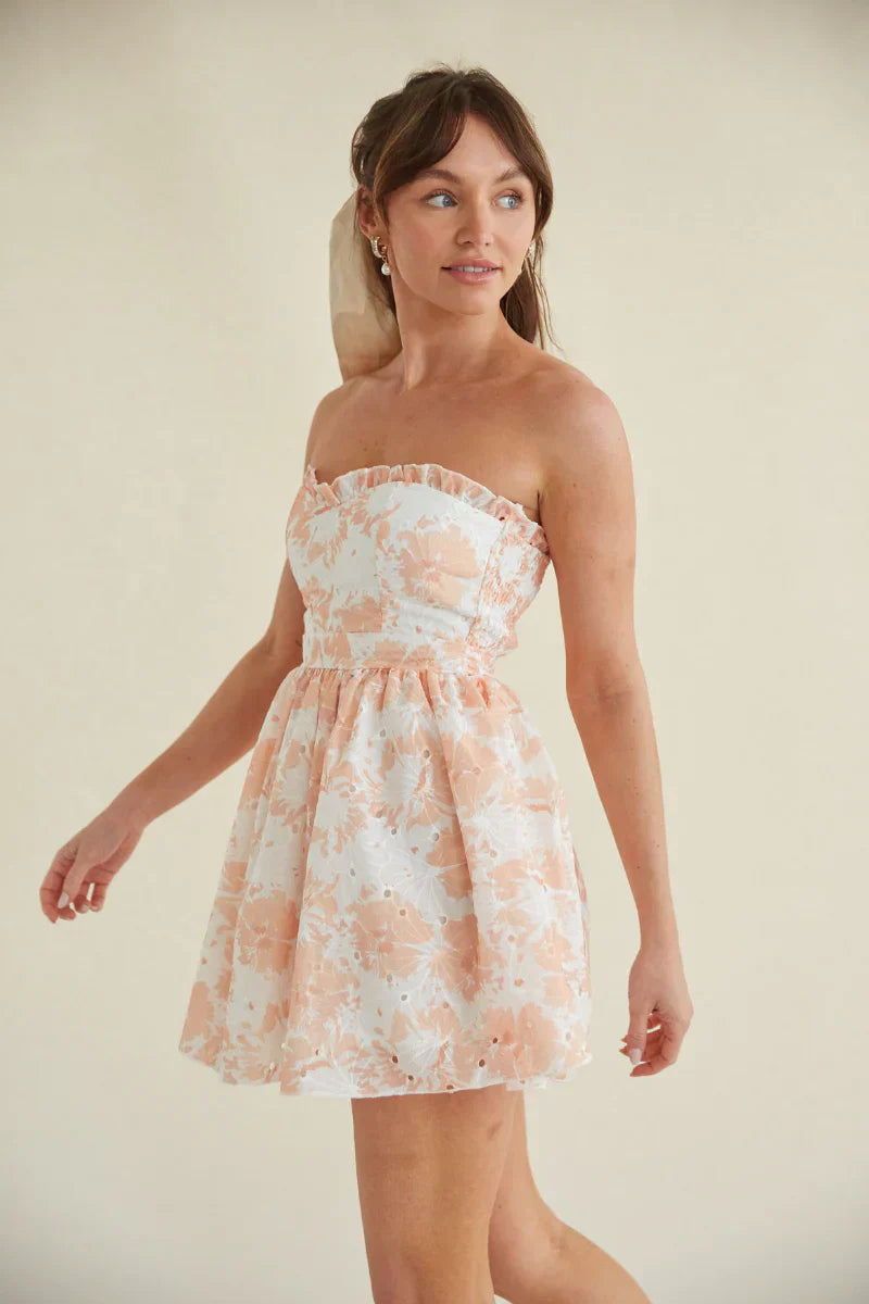 Doesn't get any cuter than the Kaylie Strapless Floral Eyelet Lace Mini Dress! This darling dress is complete an allover floral print, eyelet lace design, and a fitted bodice with a ruffle trimmed strapless sweetheart neckline. Available in orange and blue. Pair with a cute to complete the look!