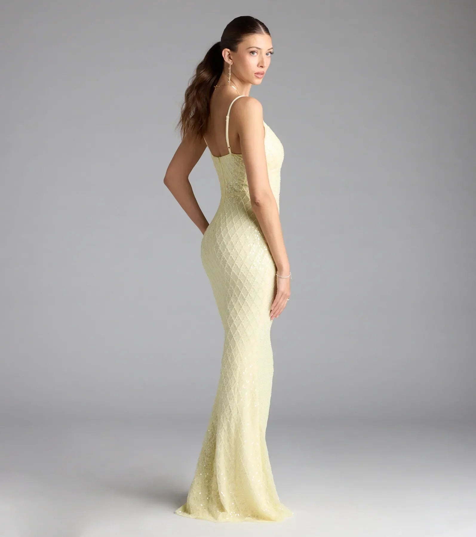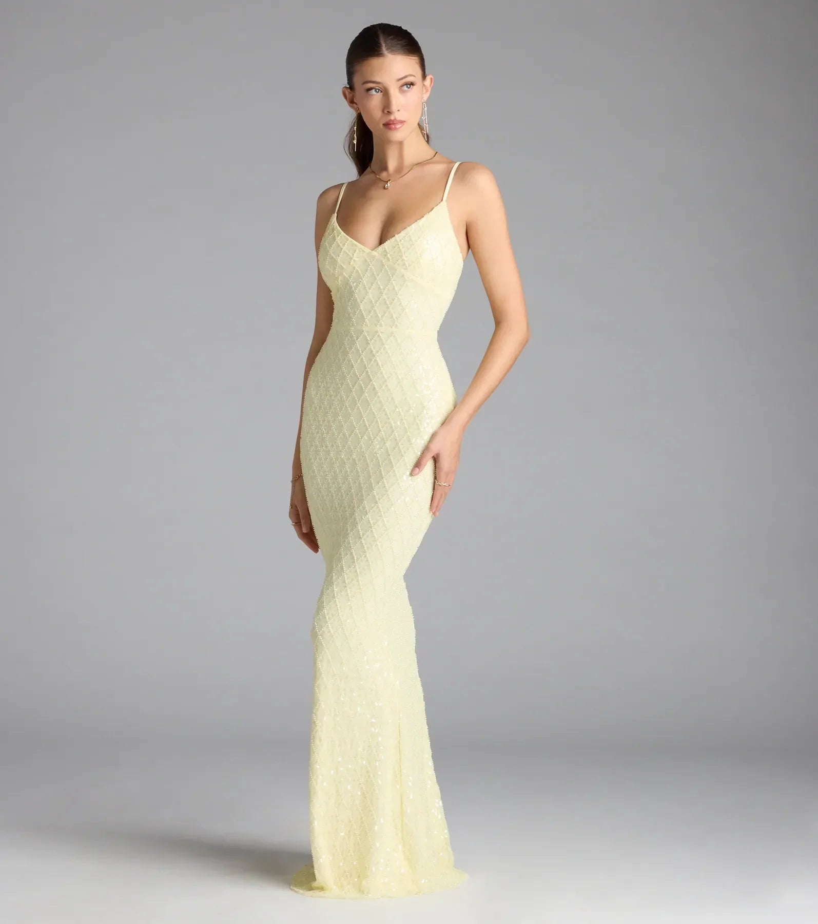Designed to dazzle, the Kaylie sequin bead formal dress is ultra glamorous and ready to have a picture taken! Strut looking fabulous in the flattering bodycon silhouette that effortlessly flares into a floor-length hem for drama.