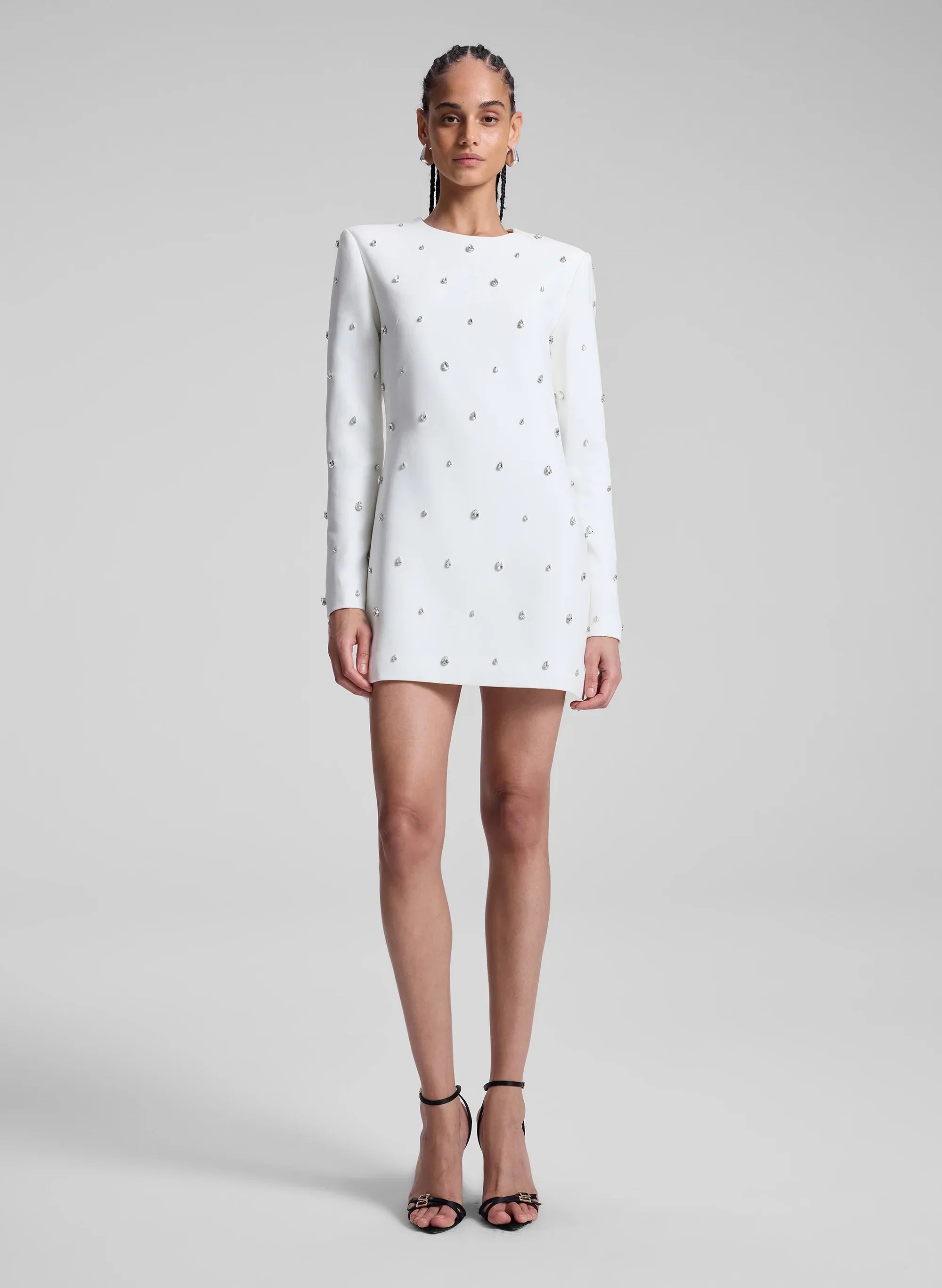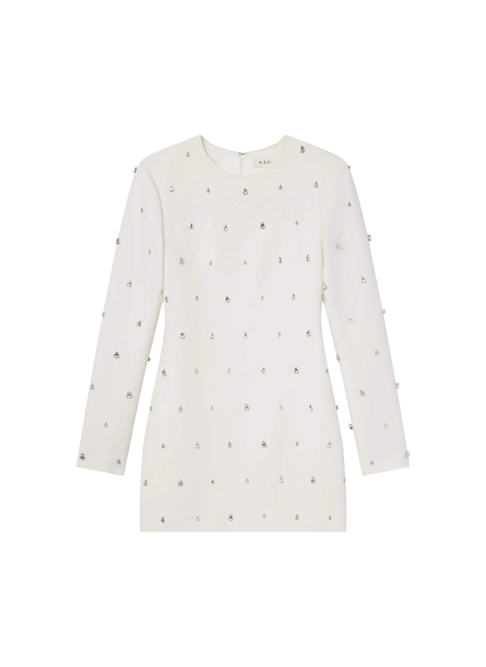 The Kenna Dress is crafted from elegant white cady fabric. offering a softly structured silhouette for modern sophistication. Scattered and hand-applied teardrop-shaped crystals add a unique take on bridal embellishment. This long-sleeve mini silhouette features a sleek. tailored fit and a rounded neckline for effortless bridal glamour. Shop Dresses.