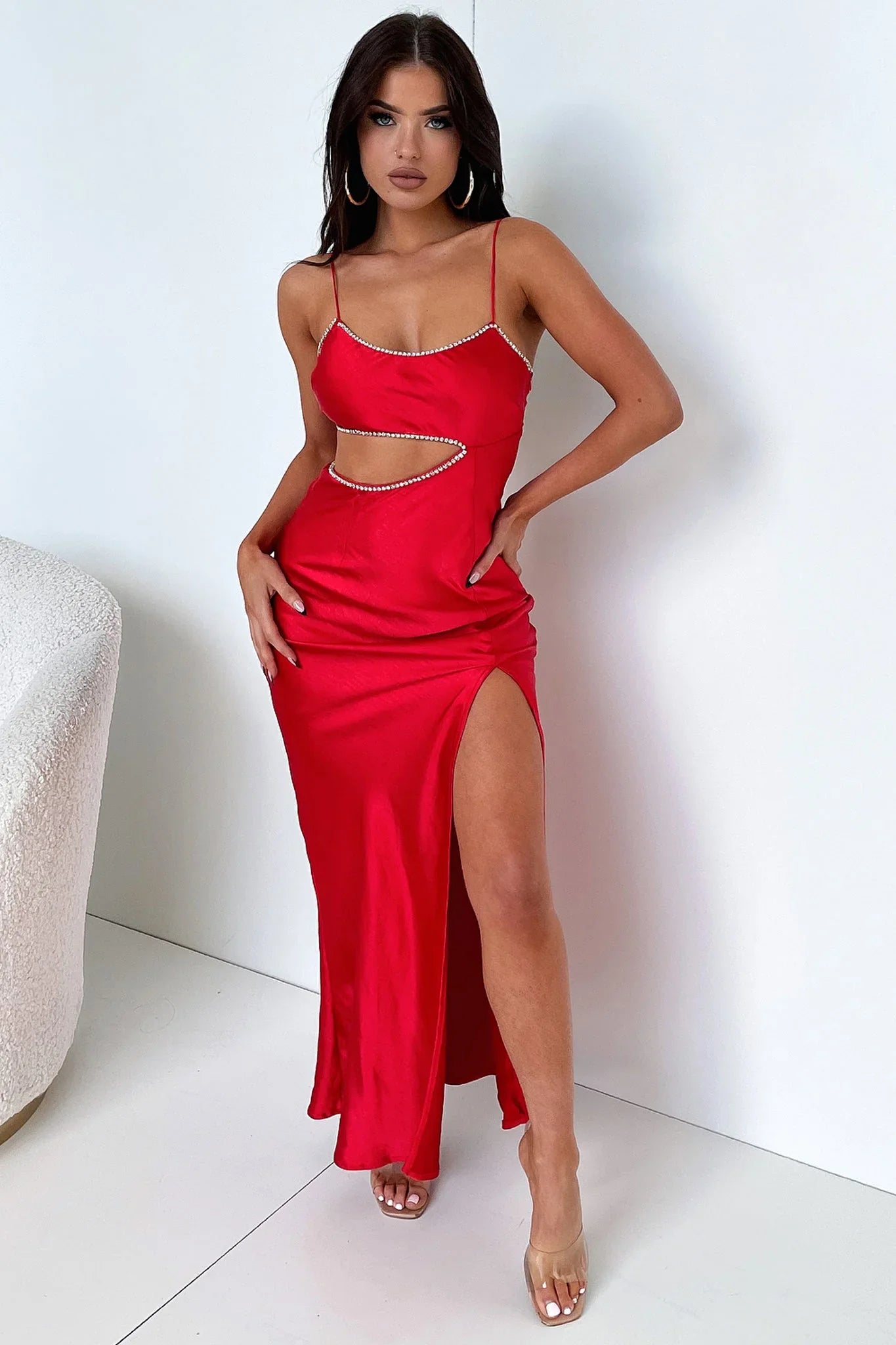 Keep it classy this formal season with the bang'n hot Kiara Maxi! She features a silky soft satin like material, double lining, thin spaghetti straps, an invisible side zipper and a cut out detail along the side of the waistline with a diamond embellished lining along the edges. Style her with black heels and a killer red lip for your formal date.