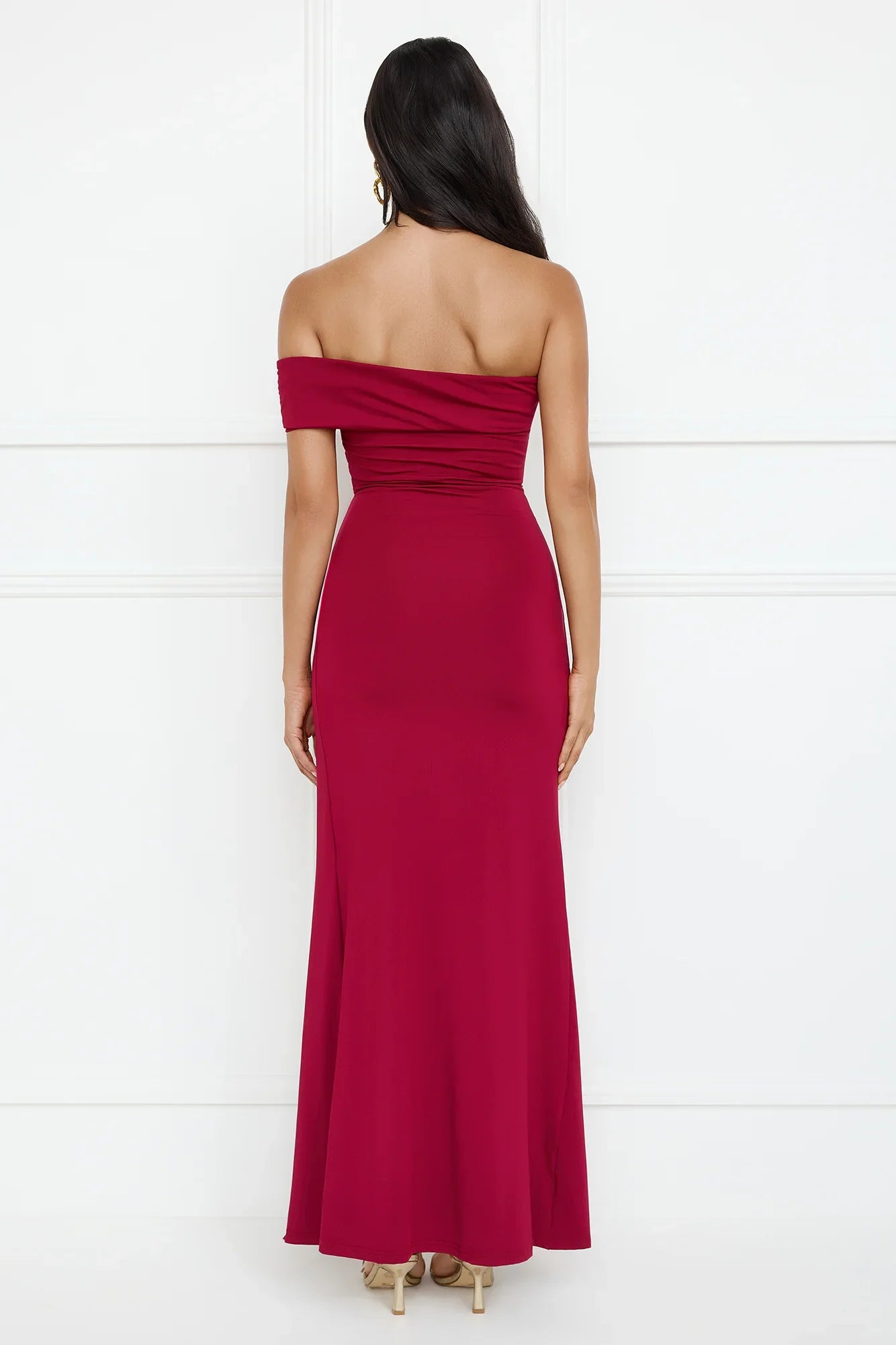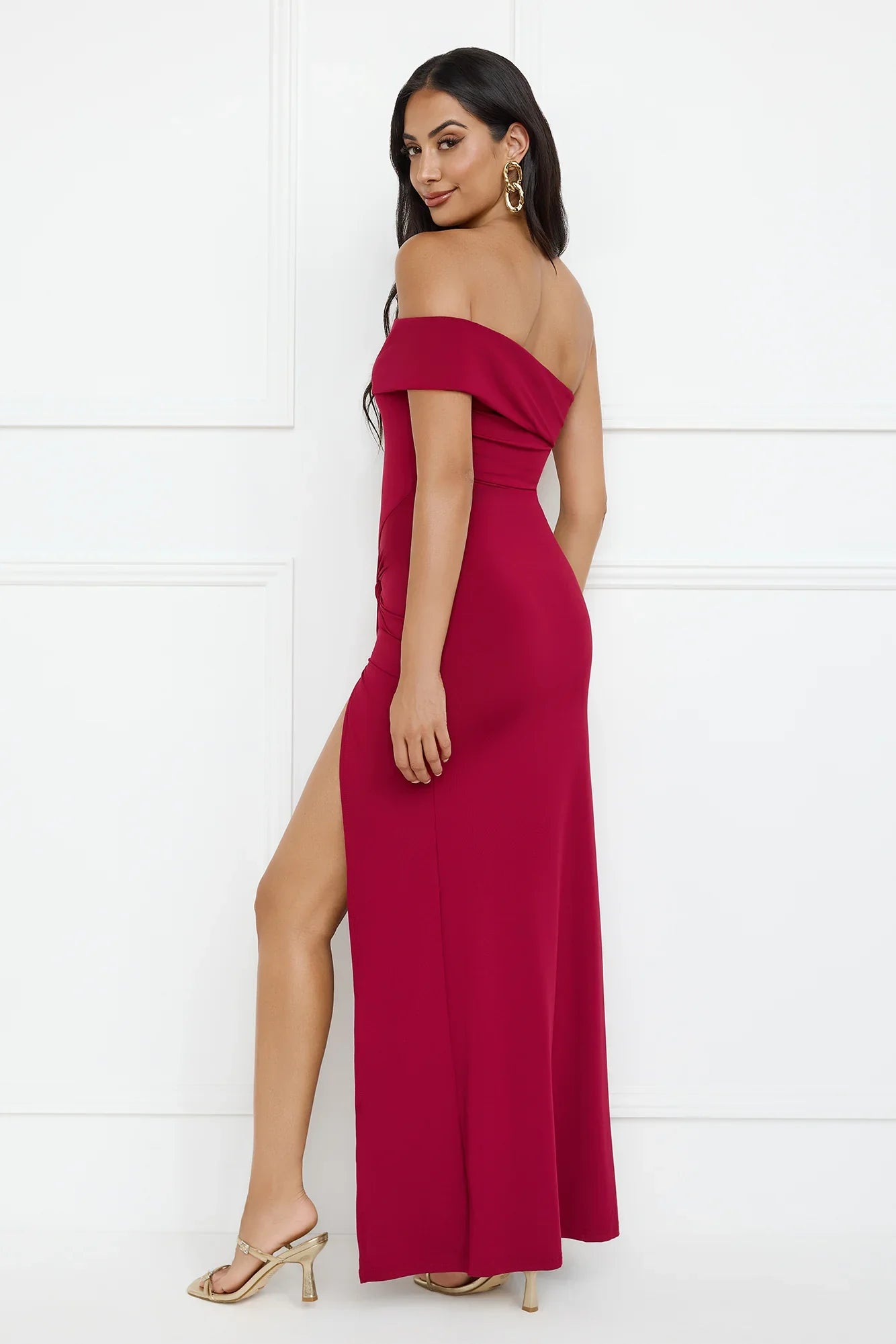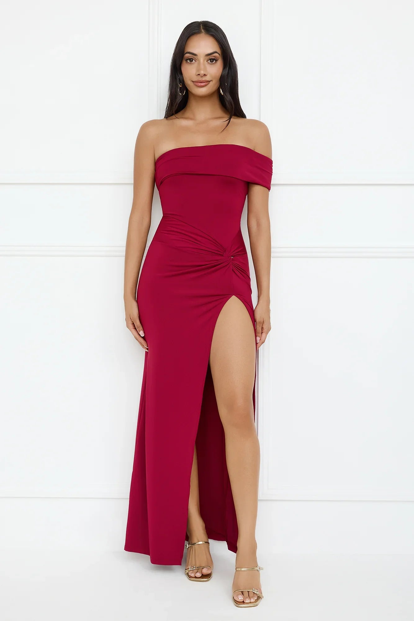 Stand out in a gorgeous style, lovely. The Lavish Luxe Off Shoulder Maxi Dress features a smooth, buttery fabrication, a twist detail, and a split to the skirt. Style with heels and curls for an impressive 'fit.