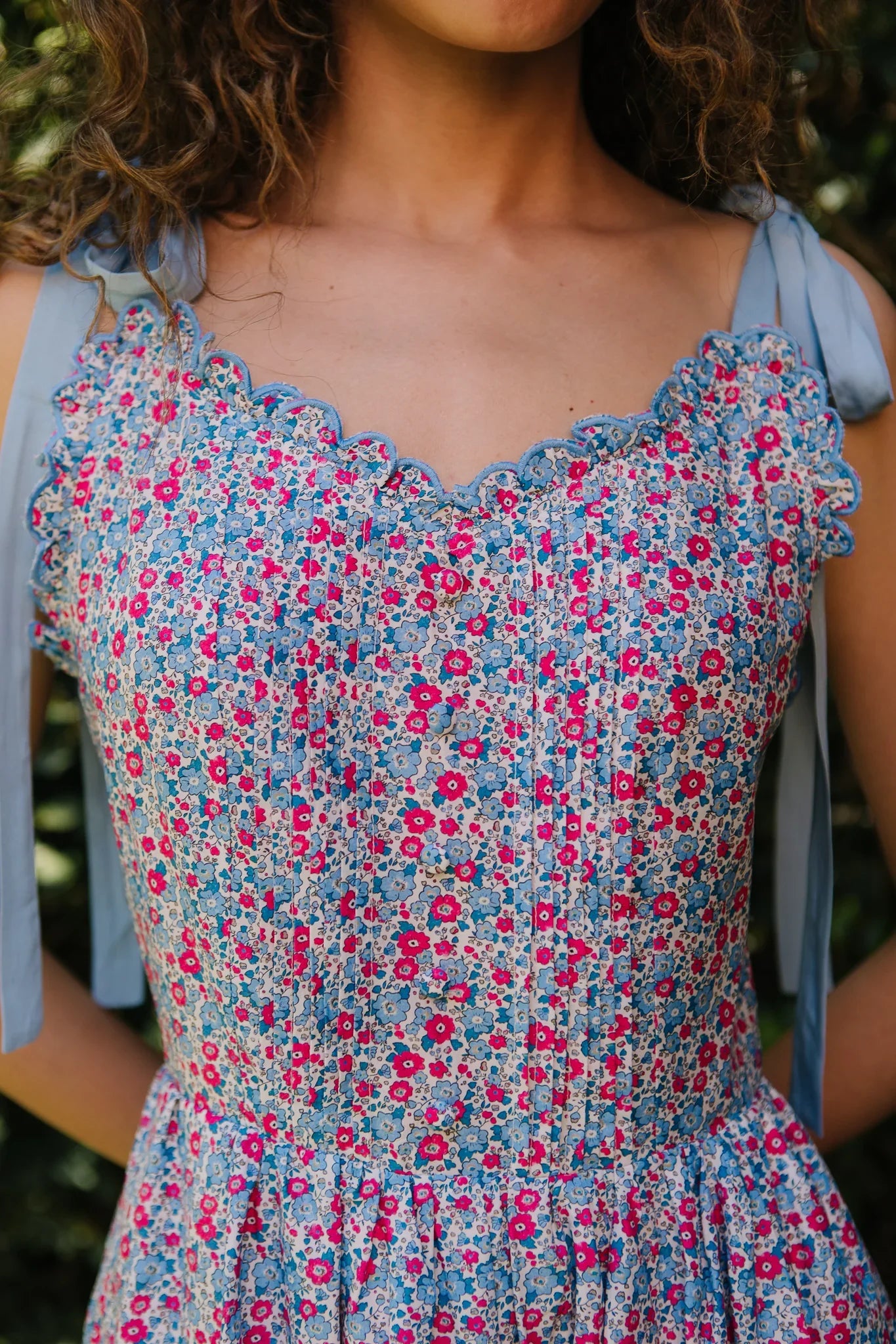 As delicate as a wildflower and thoughtfully designed for your season of bloom. The Lilianna Dress features a soft v-neckline with scalloped edges, adjustable tie straps, and a flowing tiered skirt kissed with dainty florals. With pockets for practicality and a hidden zipper for ease, it’s a nursing-friendly favorite full of grace, comfort, and quiet beauty.