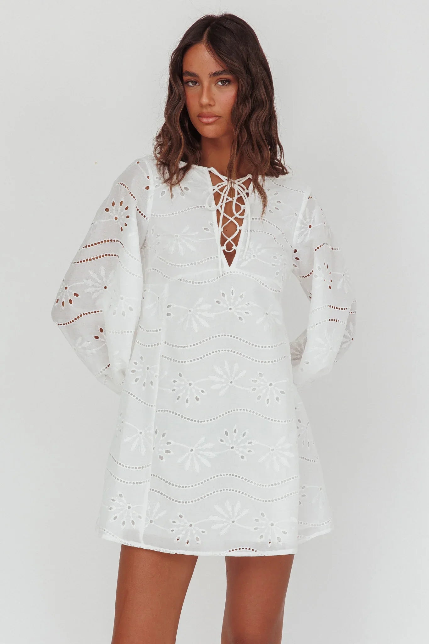 The weekend is calling, and our Long Weekend mini dress is just what you need. We are in love with its pretty eyelet fabric and lace-up detail in the neck. Perfect for coffee catch-ups with your girl teamed with sandals and a tote for a chic look.