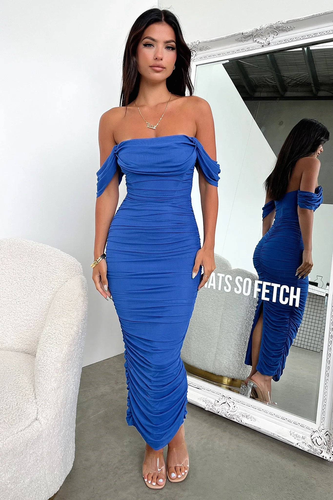 All around a total babe! The Lucinda Maxi Dress offers double lined material with a mesh top layer, ruching down the sides, a silver zipper at the back, a straight cut neckline and off shoulder sleeves. Style this beaut with black heels, a sleek pony and a red lippy for a fierce yet elegant look.