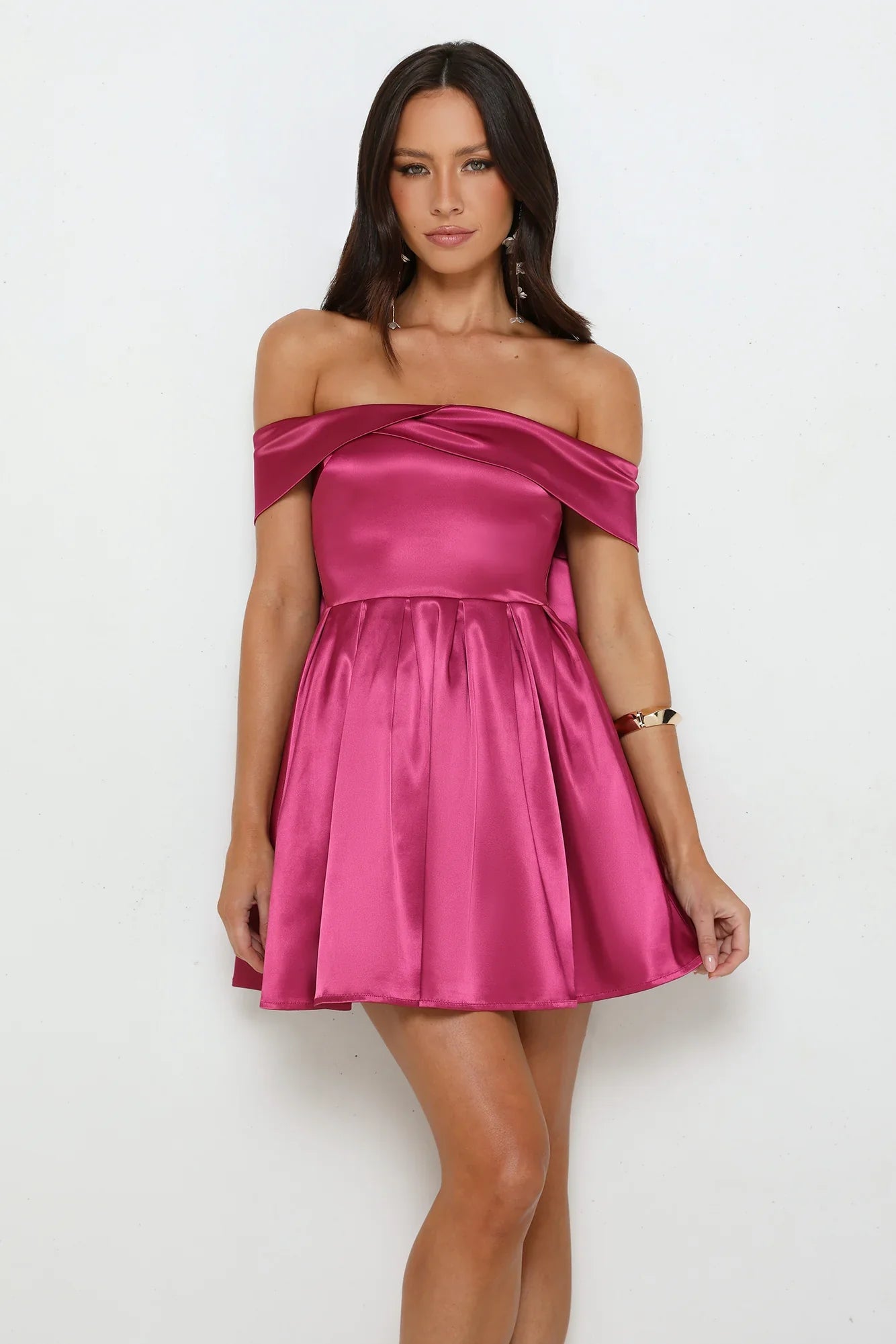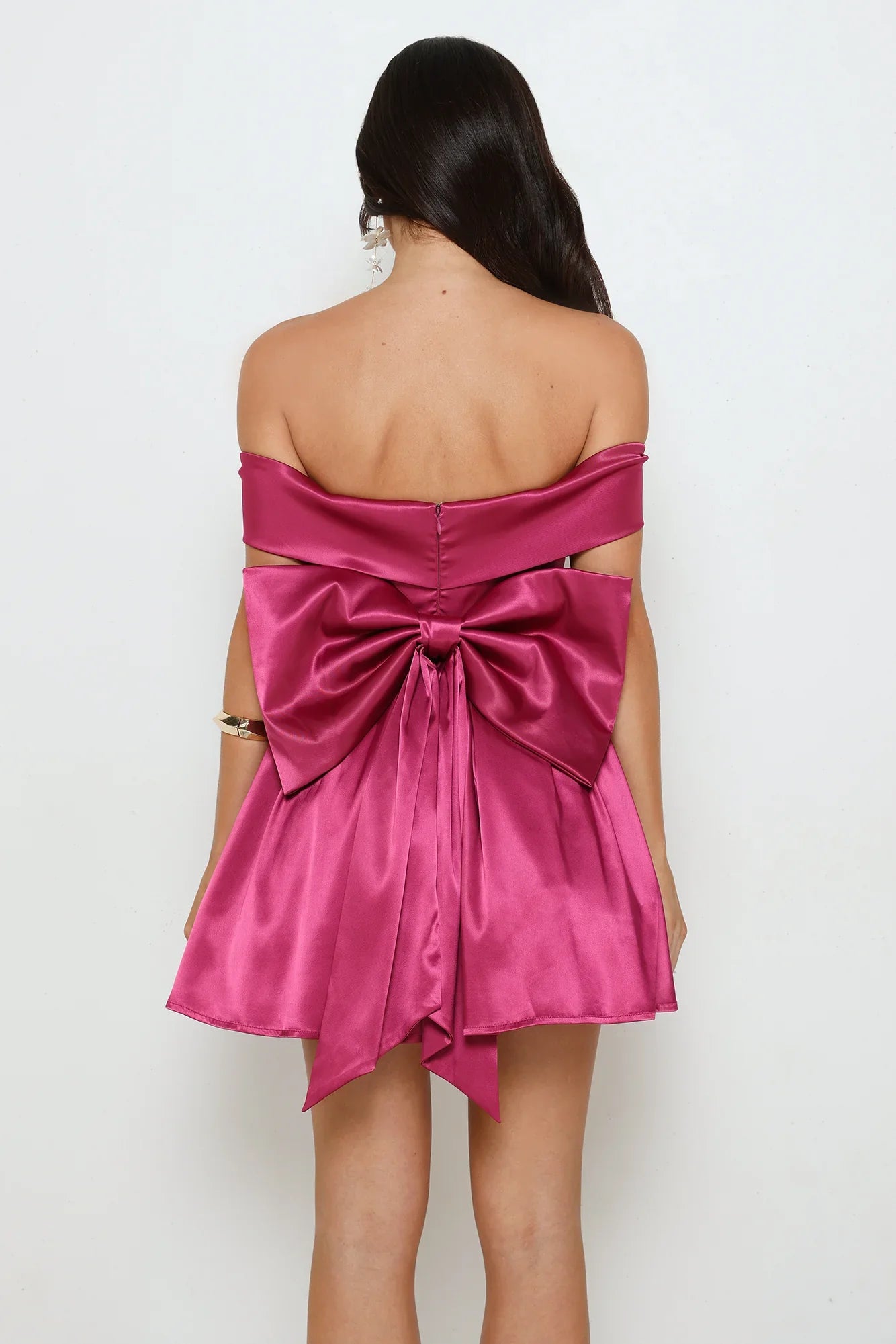 Get ready to party in the Luxe Language Off Shoulder Mini Dress, featuring a fun satin finish, fitted bodice, flowy skirt with tulle underlayer, flirty off-the-shoulder style, and a removable bow at the back for extra flair.