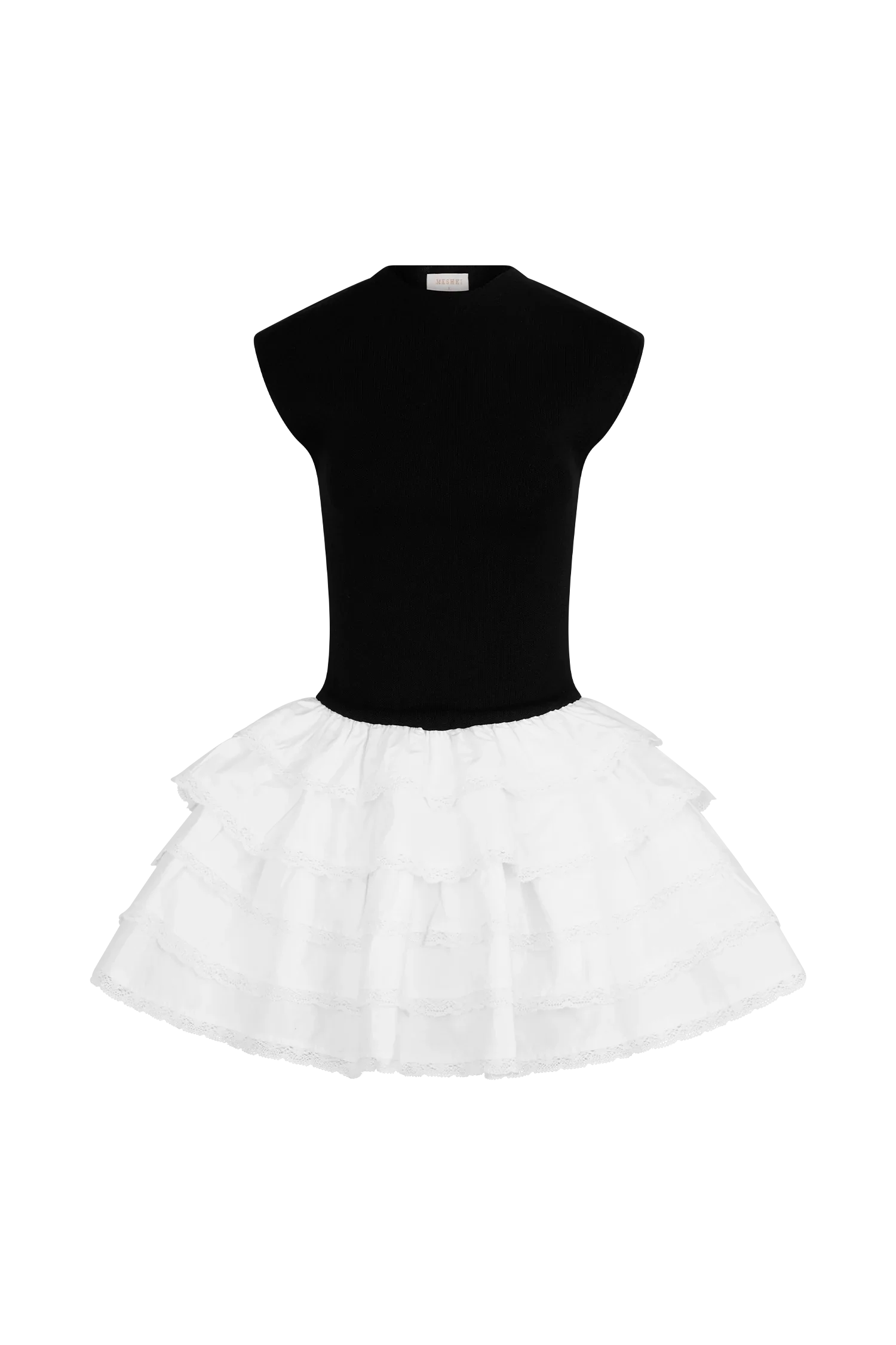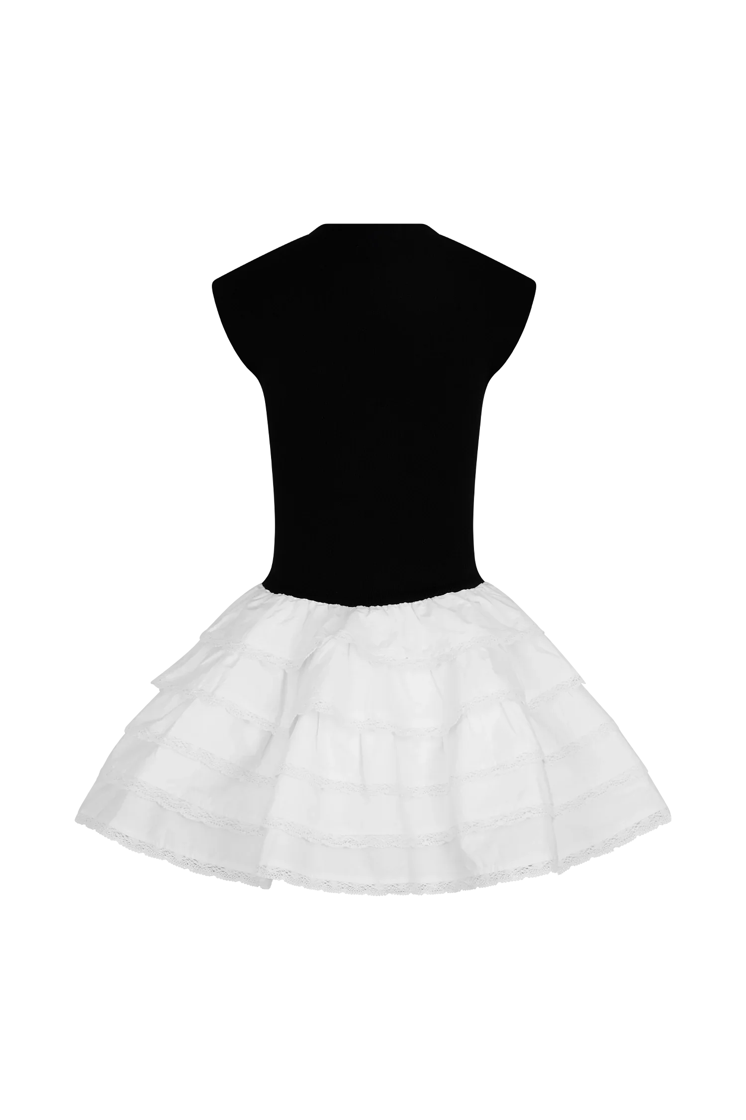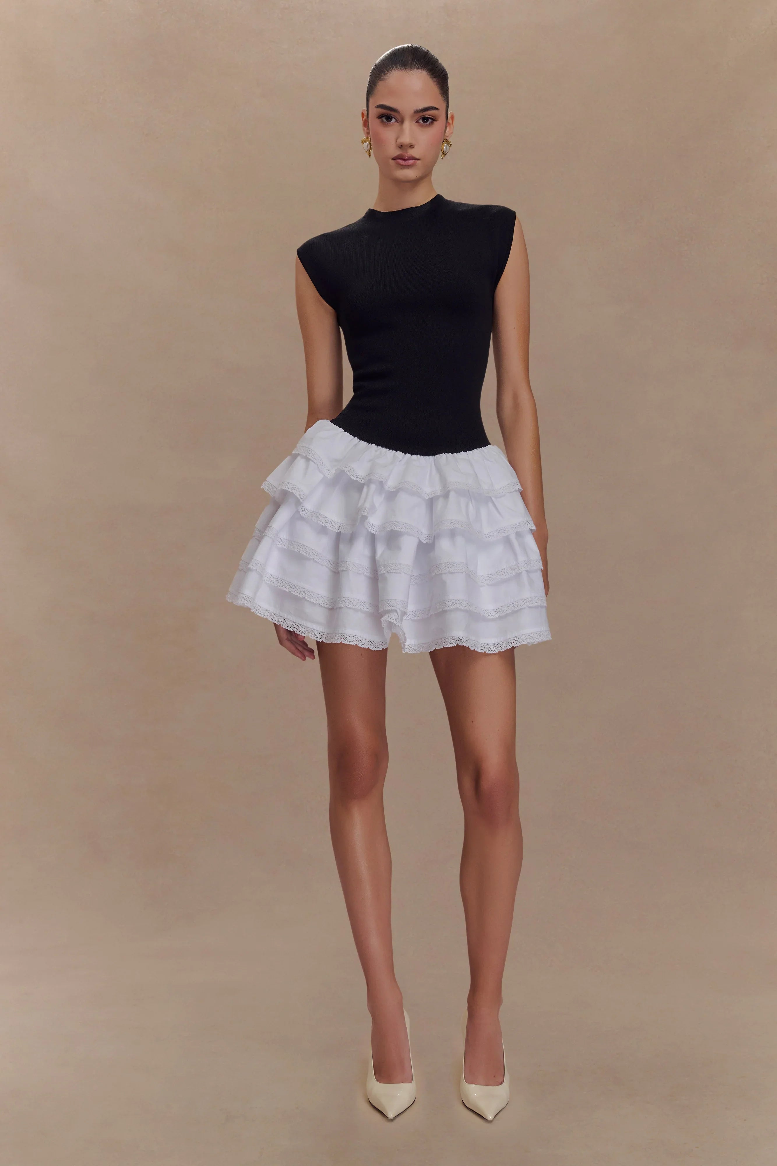 The MAEVE Ruffle Knit Mini Dress blends sophistication with playful details. The high neckline and cap sleeves create a polished, fitted bodice, while the back keyhole closure adds a touch of elegance. The drop waist design enhances your shape, flowing into a contrast skirt with gathered volume for a flattering, dynamic silhouette. Delicate lace trim along the hem adds a feminine finish. Perfect for any occasion, this mini-length dress offers a balance of chic and fun, making it a wardrobe must-have.